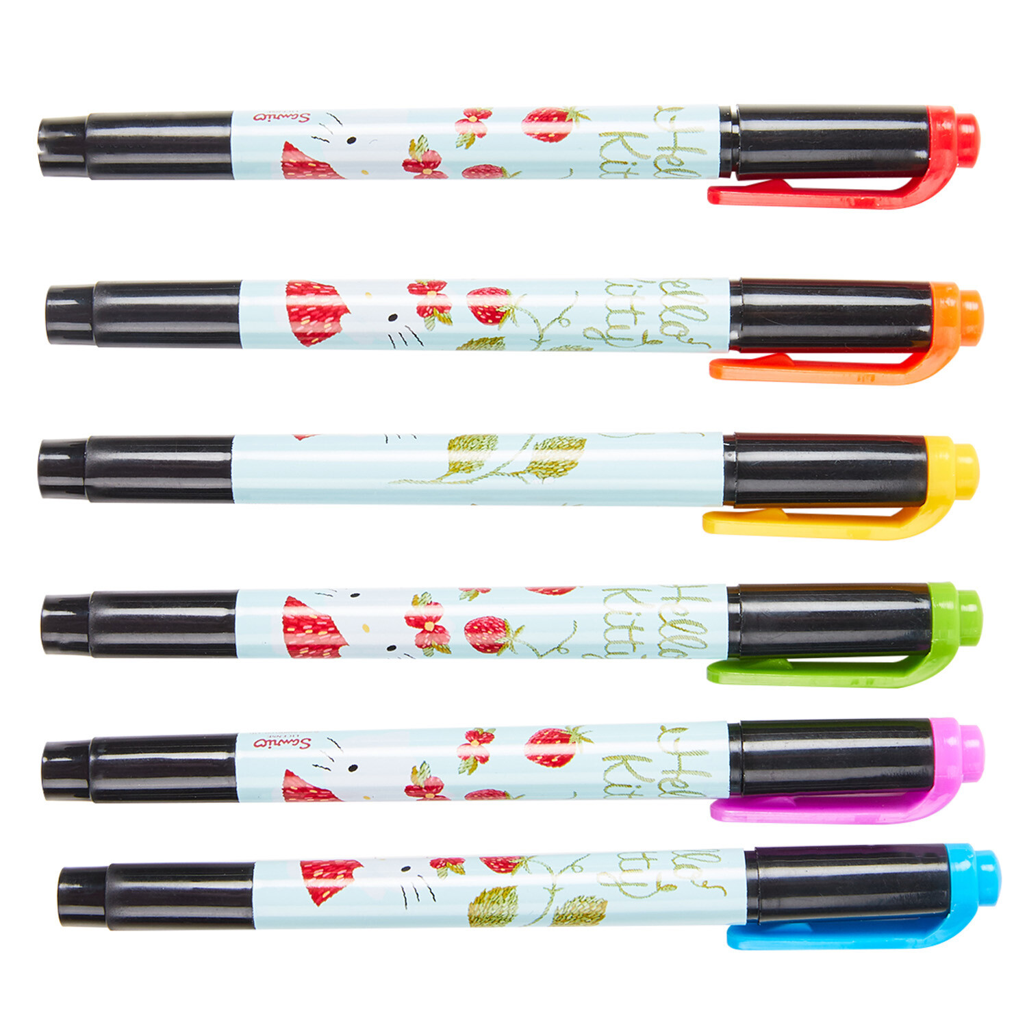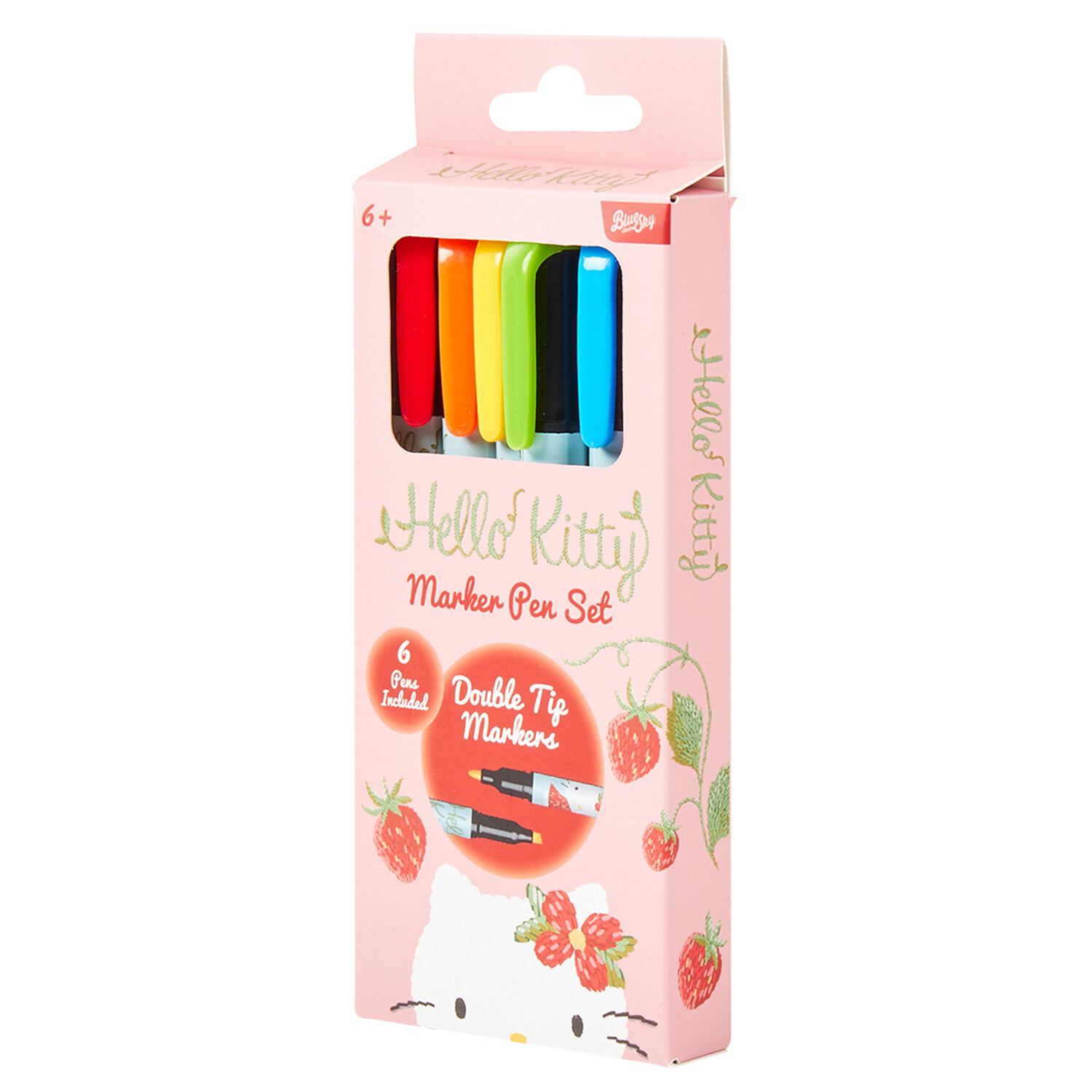 Bring creativity to life with this Pack of 6 Strawberry Hello Kitty Markers. This pack includes six colourful double-tip markers, perfect for doodling, colouring or homework highlights. Flaunting a Hello Kitty design, it makes a charming stationery essential. Whether you're a young artist or a Hello Kitty fan, this set is a fun way to add colour to your day.