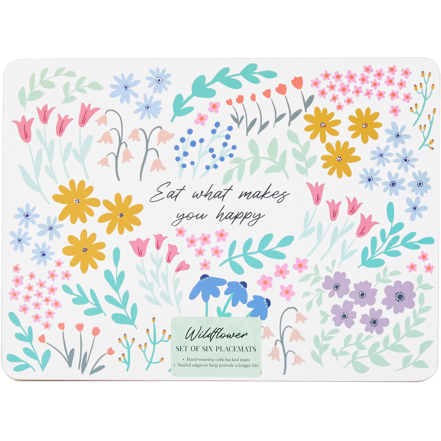 Finish your dining table setting in style with our fun and colourful Pack of 6 Wildflower Placemats. The mats are printed with a gorgeous floral design in vivid colours and the phrase 'eat what makes you happy' in the centre. They're great for protecting your tables from heat damage and spills and are cork-backed to prevent scratches. Pair them with other items from the Wildflower collection for a cohesive look in your space.