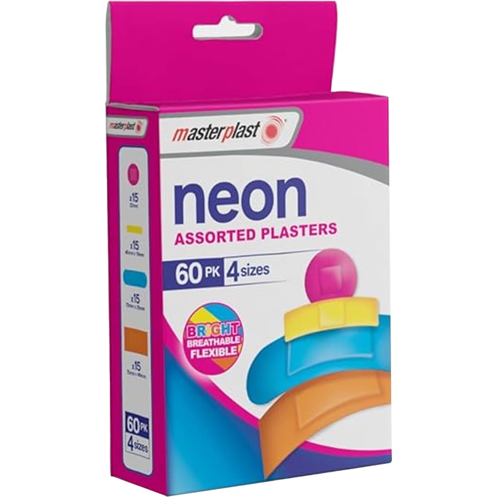 Perfect for minor cuts and scrapes, this Pack of 60 Neon Assorted Plasters is a must-have for your first-aid collection. These colourful plasters include four sizes to suit most injuries and come in an array of bold colours for a bit of fun. They have cushioned gauze to protect your injury, encourage healing, and are flexible for easy movement.