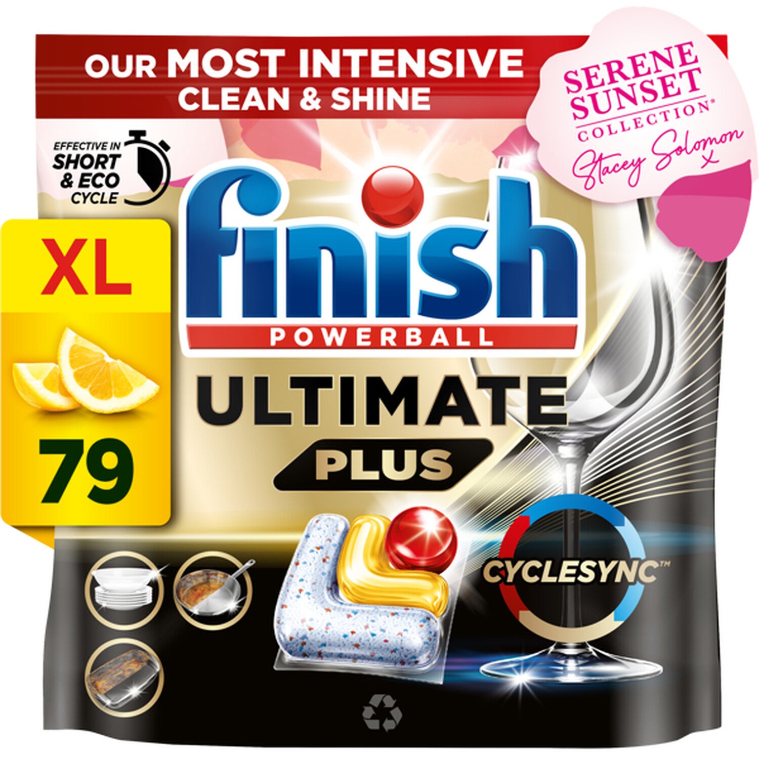 Give your dishes a shiny clean with the Pack of 79 Finish Ultimate Plus Lemon Dishwasher Tablets. These fast-dissolving dishwasher tablets feature an advanced formula that easily cuts through tough 48-hour dried-on stains, providing sparkling clean dishes. They are designed to perform well even in short and eco cycles and allow you to skip the pre-rinse routine, leaving behind a fresh citrusy fragrance with every wash.