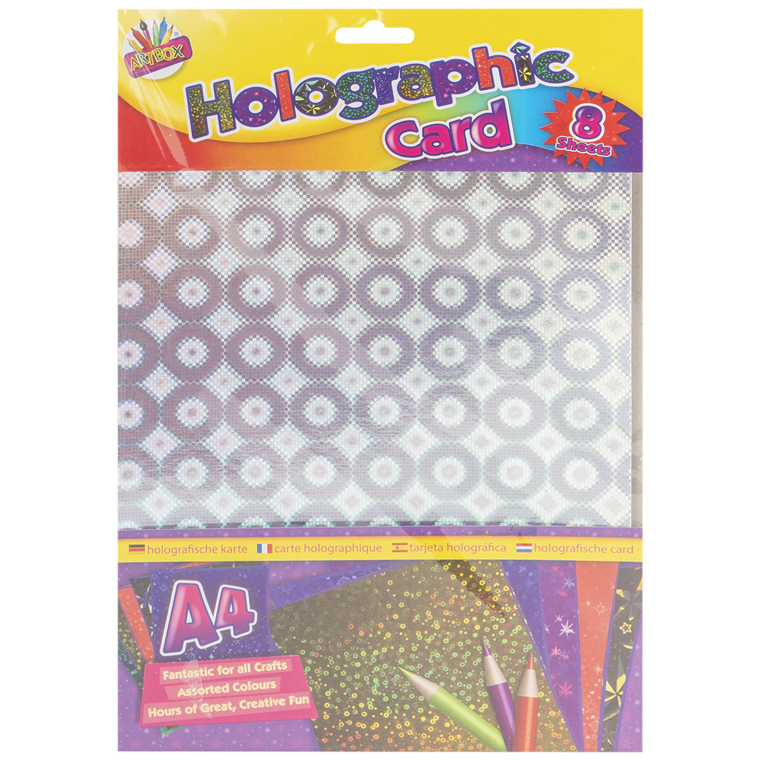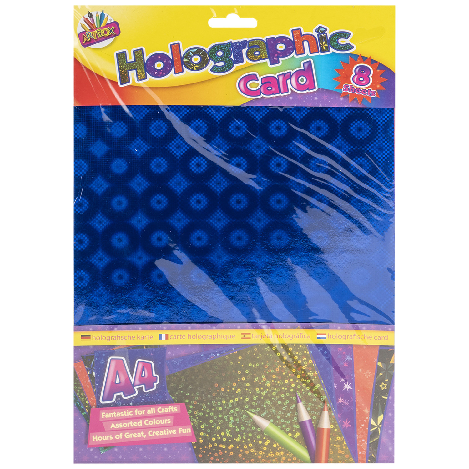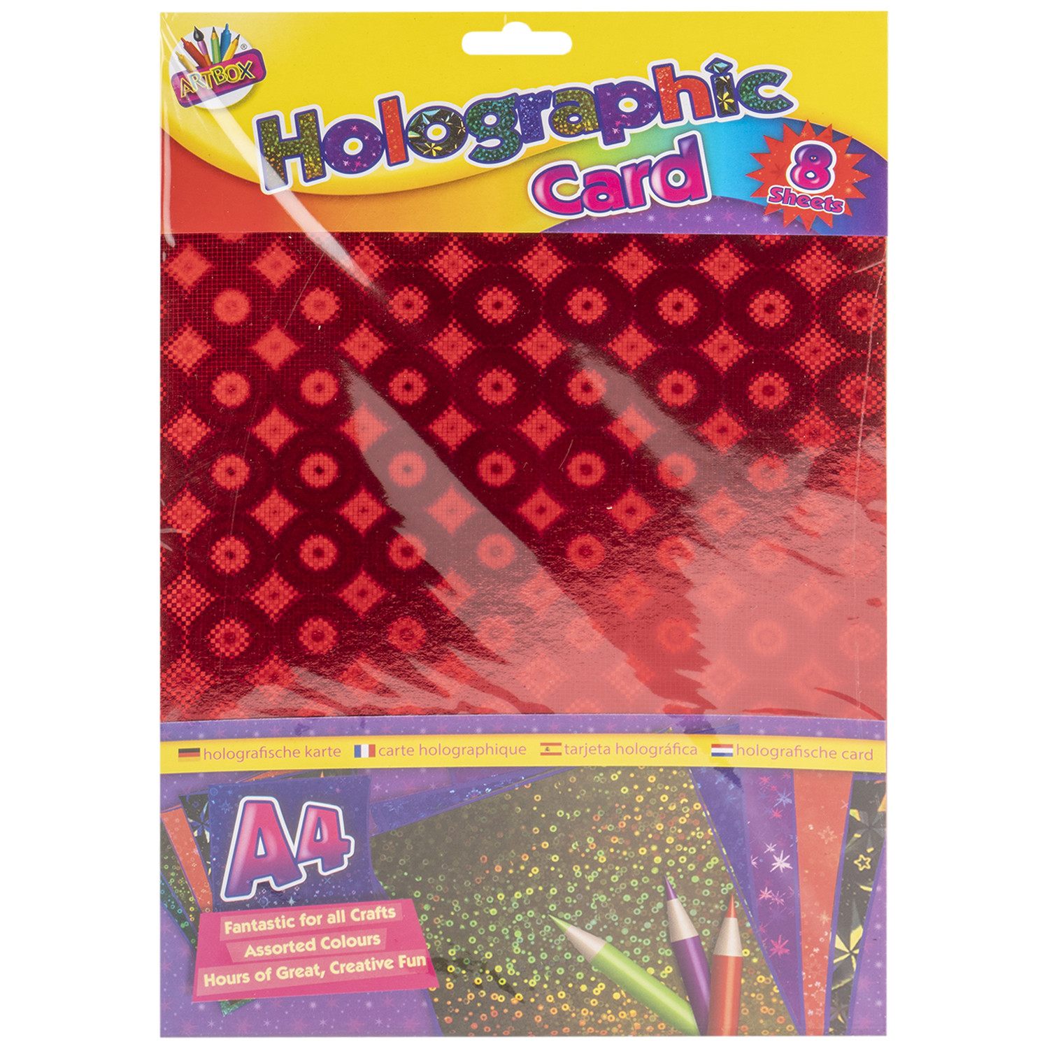 Perfect for a variety of craft projects this Holographic Card from Artbox is essential for any avid crafter's supplies box. Ideal for making greeting cards, card toppers, for mounting pictures, scrapbooking and so much more, this pack is truly versatile. In a vibrant holographic print these sheets of high-quality card are great for display boards, making bunting for special occasions and entertaining the kids on rainy days.