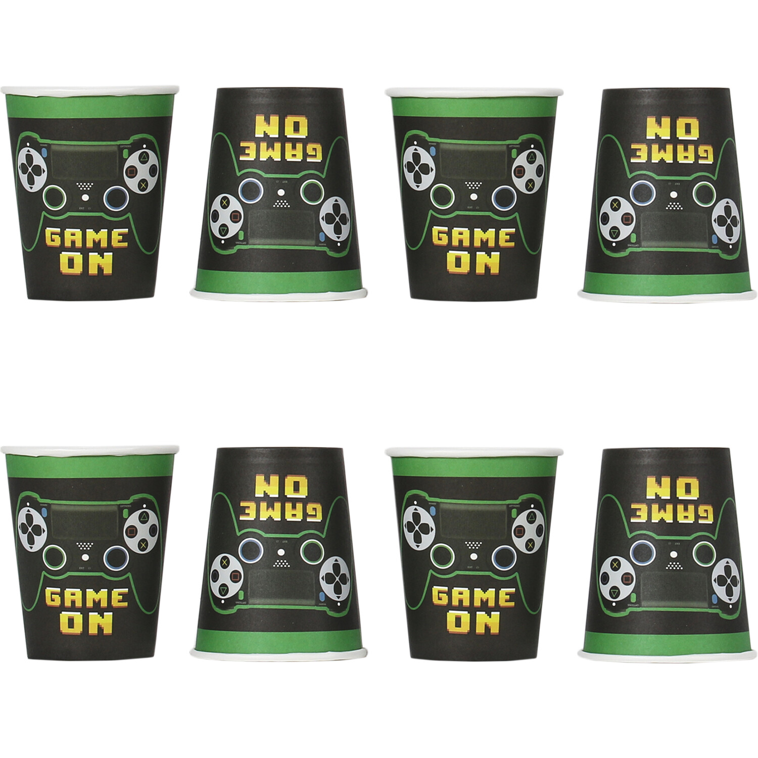 This Pack of 8 Gaming Paper Cups is perfect for a gamer-themed celebration. Featuring an image of a game controller and the phrase 'game on' written across them, they're sure to be a hit for any gaming enthusiasts.