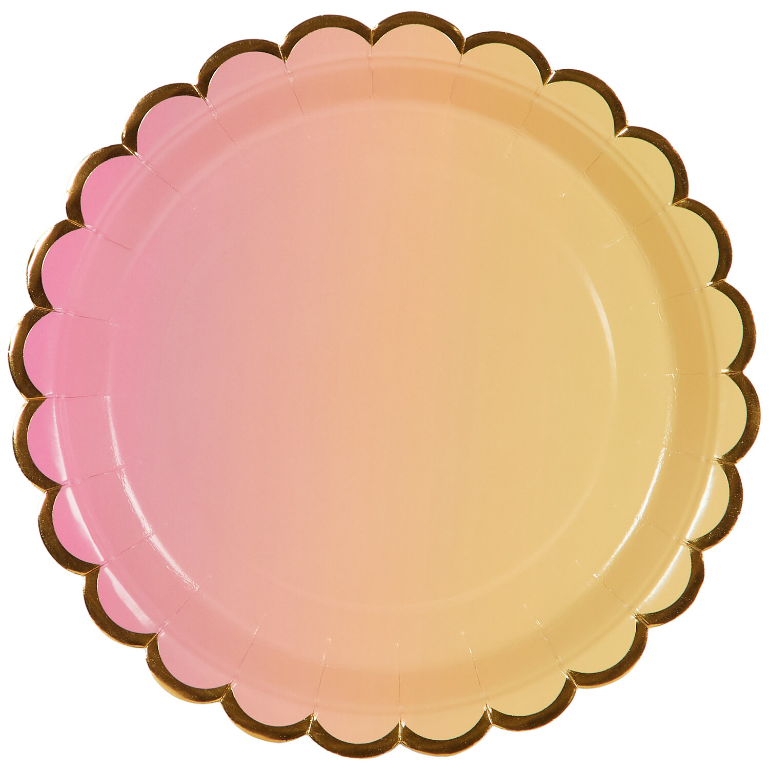 Elevate your party table decor with the Pack of 8 Pastel Party Paper Plates. Featuring four different ombre designs, inside this pack you'll find two plates in each colourway. These plates are adorned with beautiful golden trim and are easy to dispose of after the party is over, making them a perfect addition to various gatherings, and celebrations.
