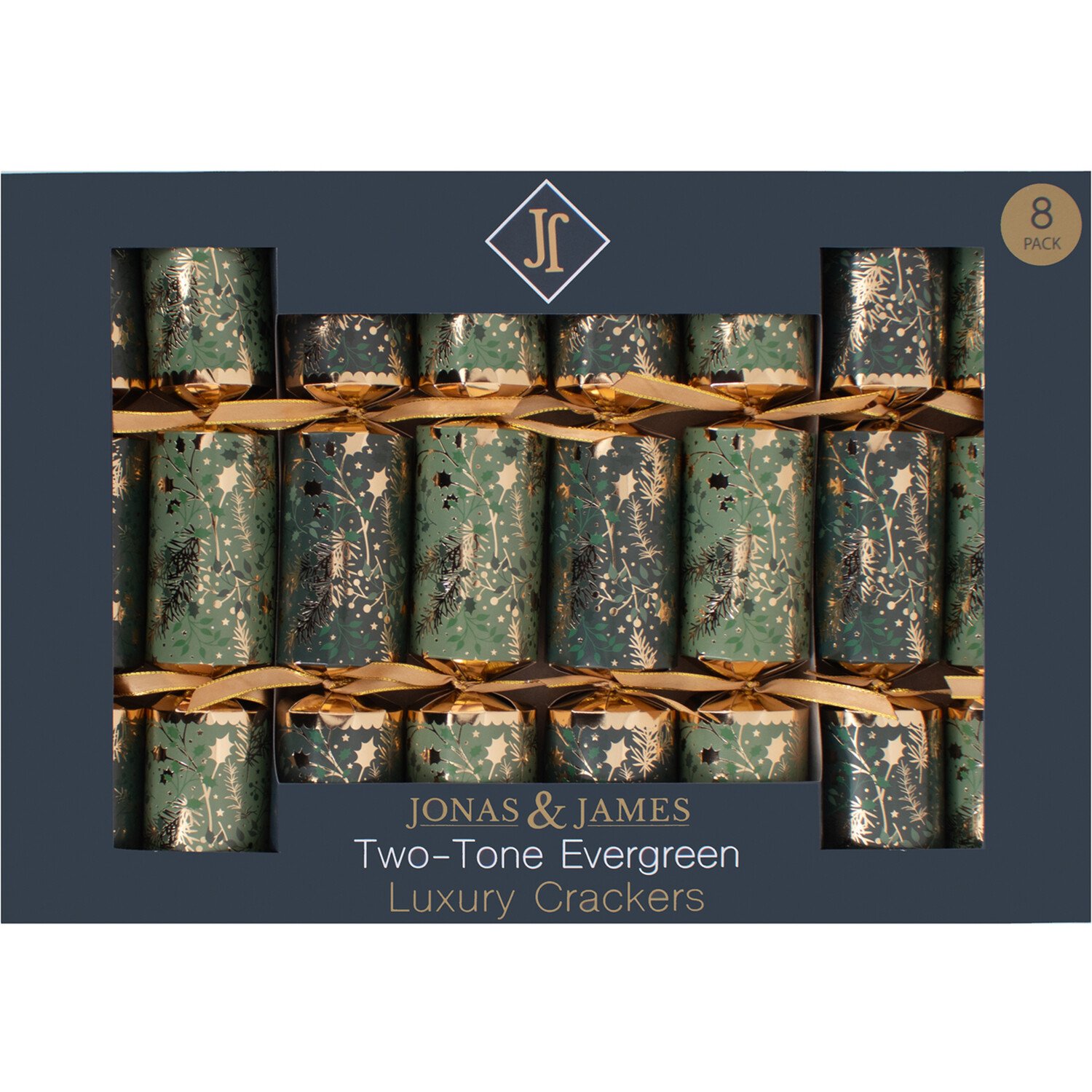 Elevate your celebrations with the Pack of 8 Two Tone Evergreen Deluxe Crackers. These crackers feature a two-tone green design with lovely gold accents to add a touch of charm to your space. With a hat, snap, motto and gift awaiting to surprise you, these crackers are perfect for enlivening your Christmas parties.