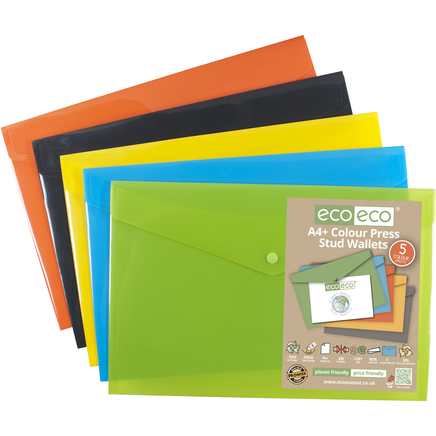 Keep your documents, paperwork, photos and more secure with this Pack of Five Colour Press Stud Wallets. Perfect for home, office and school use, each set has five different coloured wallets included, all with a smooth finish and superior strength.