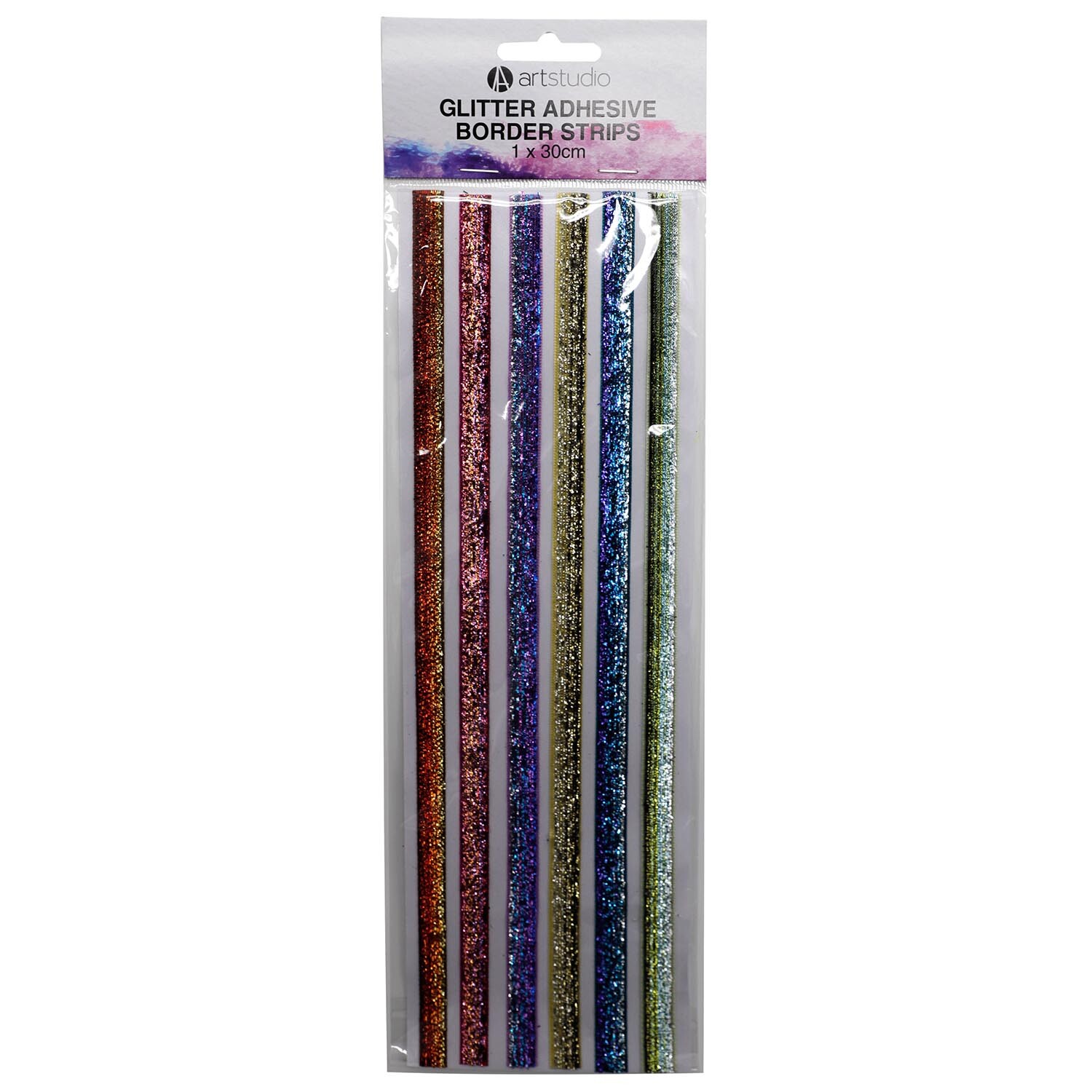 Add a dazzling touch to a variety of arts and crafts projects with this Pack of Six Art Studio Glitter Adhesive Border Strips. With six shimmering strips measuring 30 centimetres long, these are perfect for adding to greetings cards, decorations, scrapbooks and more.