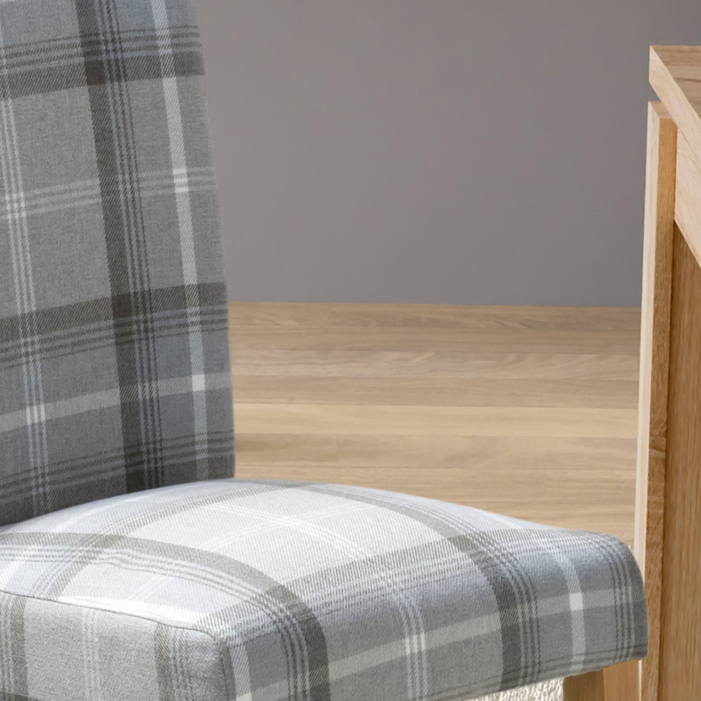 Add a touch of elegance to your dining space with this Set of Two Karta Check Grey Dining Chairs. This classic dining chair features a roll-back design complemented by an upholstered back in a striking grey check fabric. With its sprung and belted seat and natural rubberwood legs, this chair offers comfort and looks. The legs of the chairs are supplied in boxes of two, which require assembly.