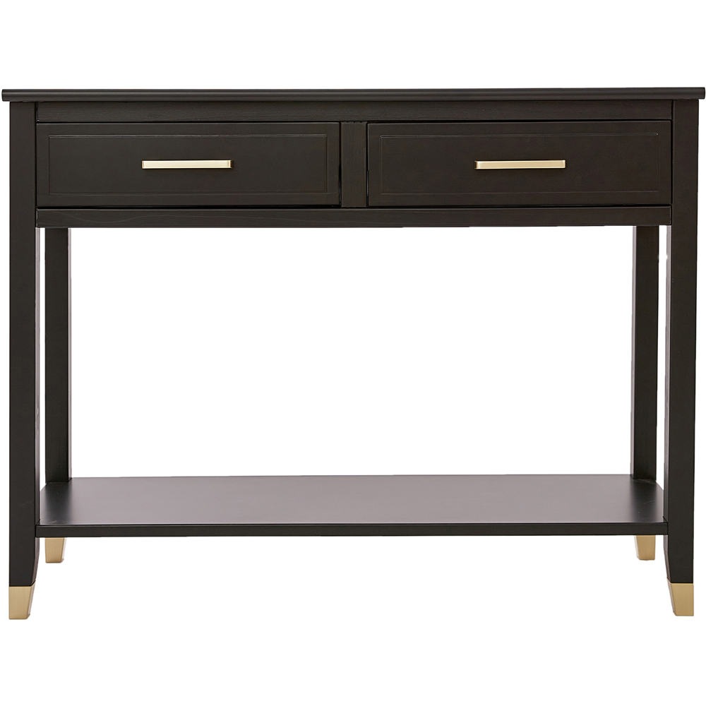Upgrade your home decor with this Palazzi Console Table. This black-coloured console table features a sophisticated design and has multiple finishes with gold accents, which gives this table an outstanding look that can go with any interior. The table is made with solid wood MDF for a sturdy build. It has two drawers completed with gold metal handles and feet, making it versatile and giving you plenty of space for your daily essentials or decorations. With its matt finish, this table can be the perfect choice to add an elegant touch to your decor. The dimensions of the table are H80 x W105 x D35cm.