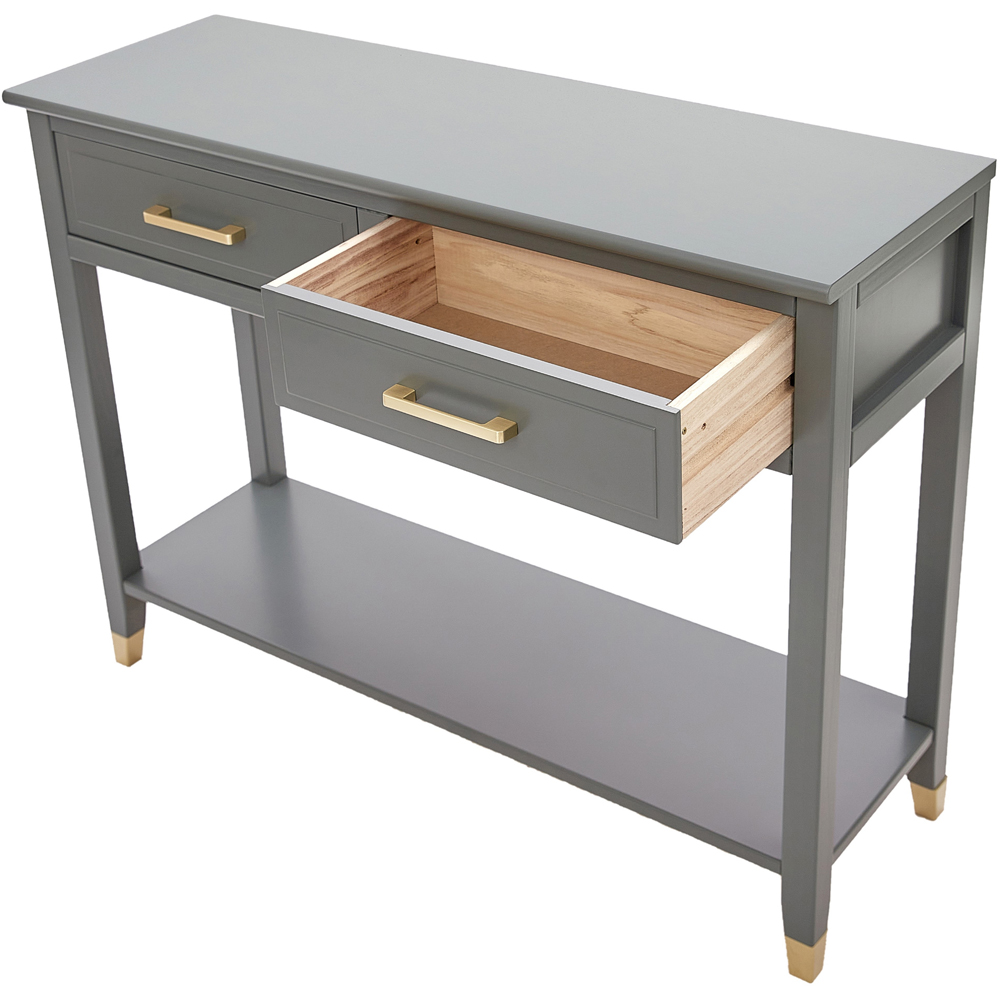Upgrade your home decor with this Palazzi Console Table. This grey-coloured console table features a sophisticated design and has multiple finishes with gold accents, which gives this table an outstanding look that can go with any interior. The table is made with solid wood MDF for a sturdy build. It has two drawers completed with gold metal handles and feet, making it versatile and giving you plenty of space for your daily essentials or decorations. With its matt finish, this table can be the perfect choice to add an elegant touch to your decor. The dimensions of the table are H80 x W105 x D35cm.