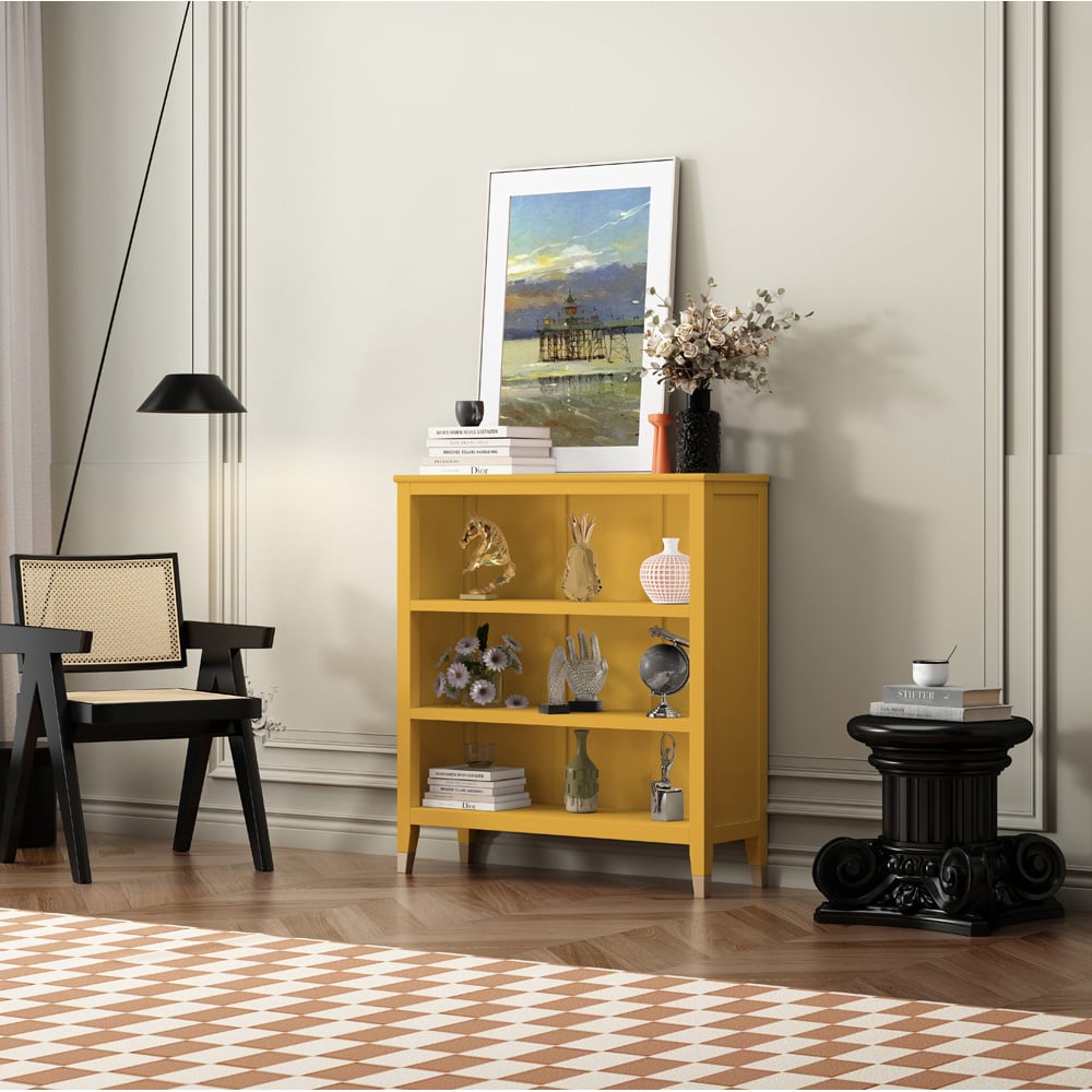 Store your books in a classy way with this Palazzi Bookcase. This mustard-coloured bookcase features a sophisticated design and has multiple finishes with gold accents, which gives this bookcase an outstanding look that can add character to any environment. The bookcase is made with solid wood MDF for a sturdy build. It has three shelves completed with gold metal feet, making it versatile and giving you plenty of space for your books or decorations. With its matt finish, this bookcase can be the perfect choice to add an elegant touch to your decor. The dimensions of the sideboard are H97 x W89 x D25cm.