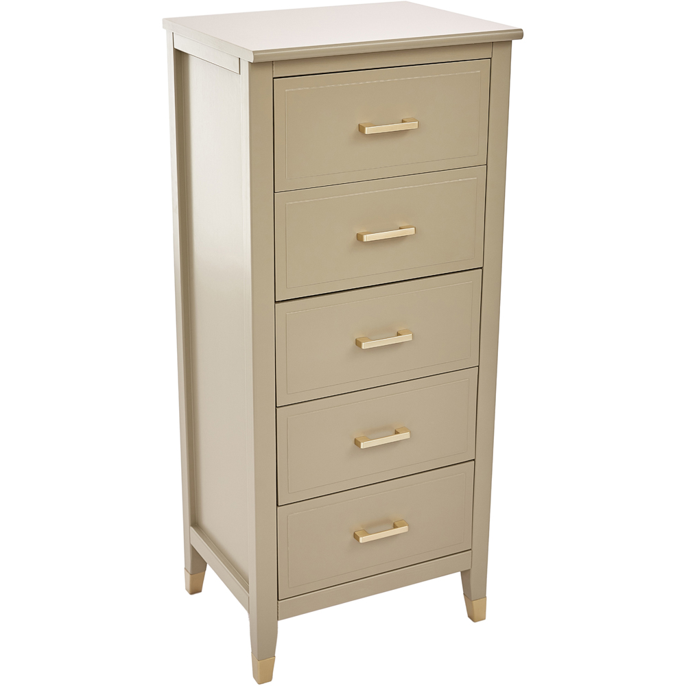 - Features 5 drawers with gold metal handles