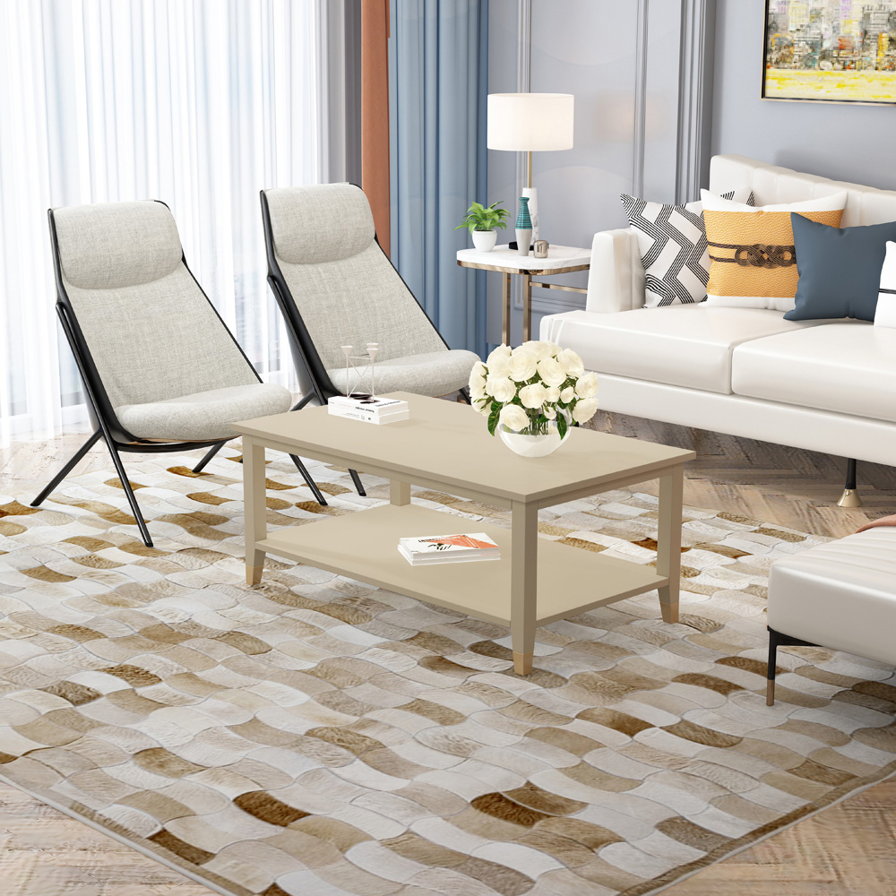 Stylishly enjoy your coffee with this Palazzi Coffee Table. This clay-coloured coffee table features a sophisticated design and has multiple finishes with gold accents, which gives this table an outstanding look that can go with any interior. The table is made with solid wood MDF for a sturdy build. It has a large base shelf complemented by a sufficient tabletop surface with gold metal feet, making it versatile while giving you space for daily essentials or decorations. With its matt finish, this table can be the perfect choice to add an elegant touch to your decor. The dimensions of the table are H45 x W100 x D56cm.