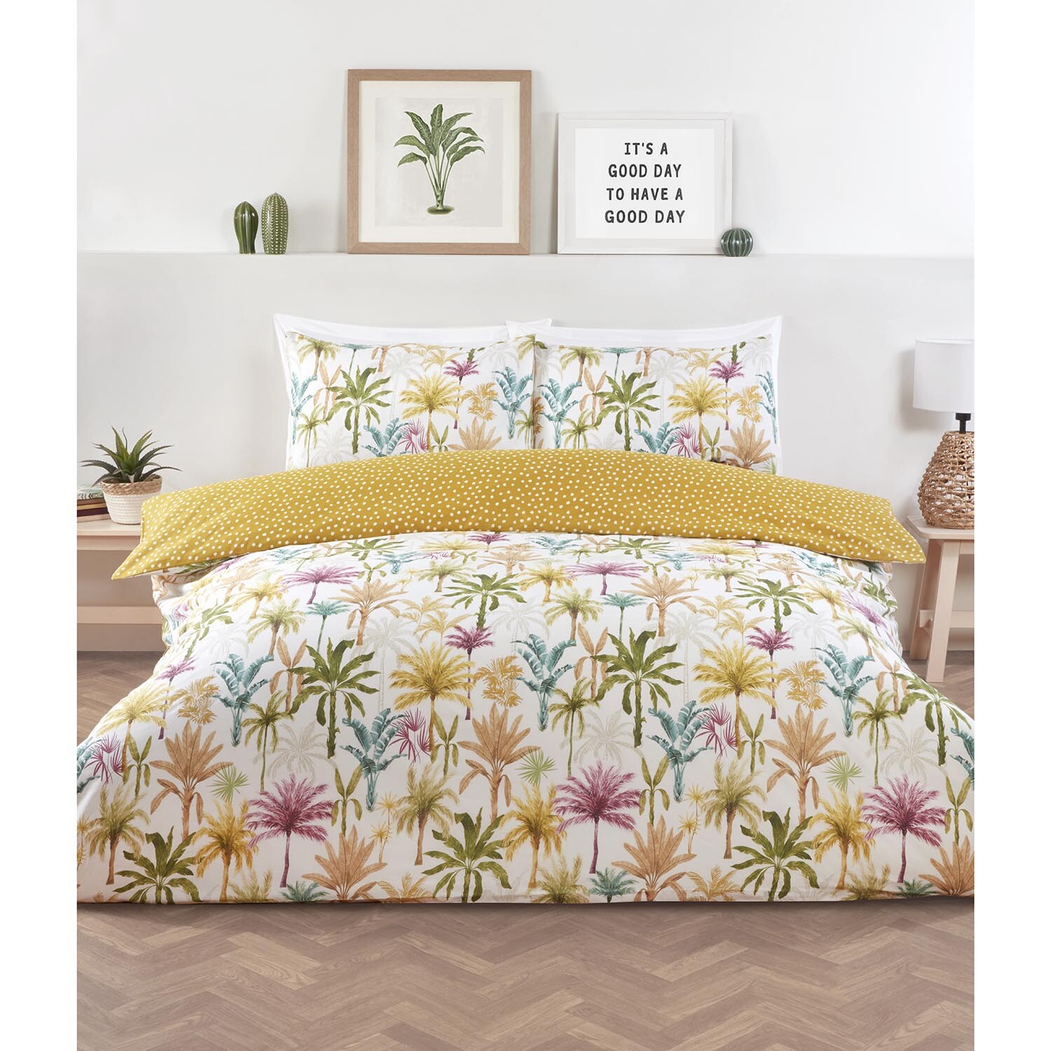 Bring bright tropical colour to your bedroom with this Palmera Palm Duvet Cover and Pillowcase Set. Made from comfortable polycotton, this bedding features a trendy palm print on one side and a white and ochre polka dot on the reverse. A quick and easy way to brighten up your home, it's sure to make your bedroom even more inviting.