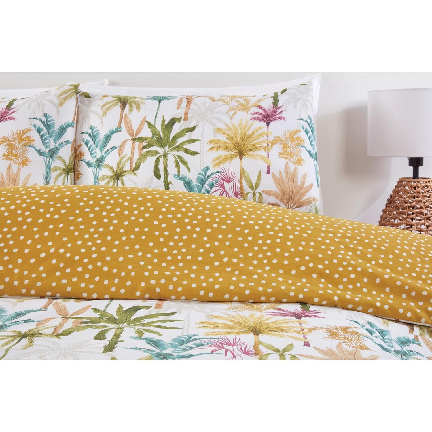 Bring bright tropical colour to your bedroom with this Palmera Palm Duvet Cover and Pillowcase Set. Made from comfortable polycotton, this bedding features a trendy palm print on one side and a white and ochre polka dot on the reverse. A quick and easy way to brighten up your home, it's sure to make your bedroom even more inviting.