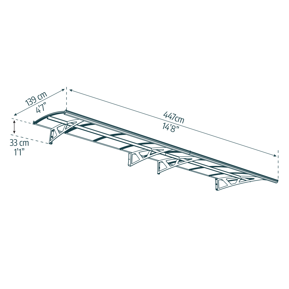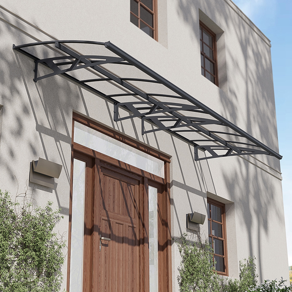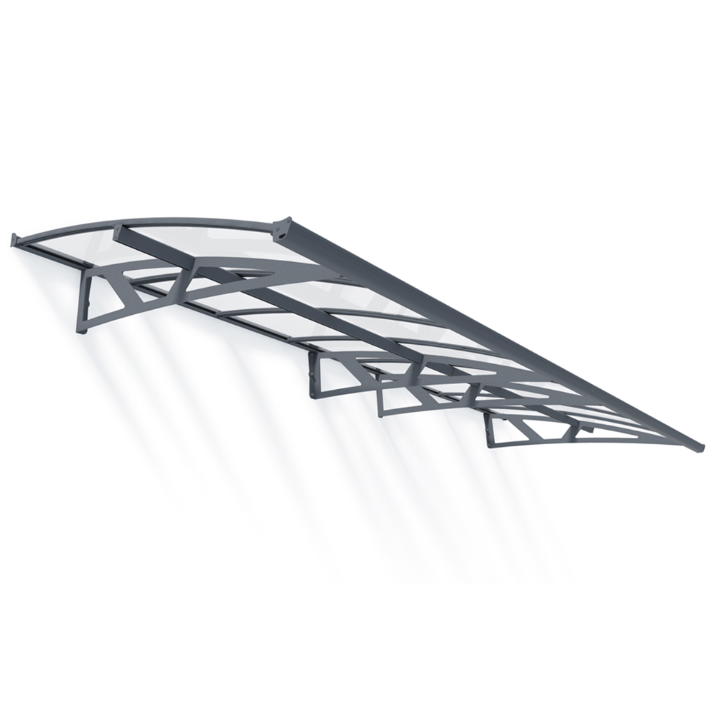 Transform your entrance with the Palram Canopia Amsterdam 4460 Grey Clear Door Canopy. Constructed from durable, powder-coated, galvanised steel support arms and enhanced with a stylish aluminium front gutter and back trims, this awning is designed not only to protect but also impress. The high-impact, 100% UV-resistant solid panels ensure that your entrance remains dry while blending seamlessly with any home decor. Elevate your curb appeal and provide your home with the robust protection it deserves. With ultra-safe 3mm solid panels and an easy DIY assembly kit that requires no special tools, you can enjoy the perfect mix of style and practicality in no time. Dimensions: 4.5 x 1.4m.