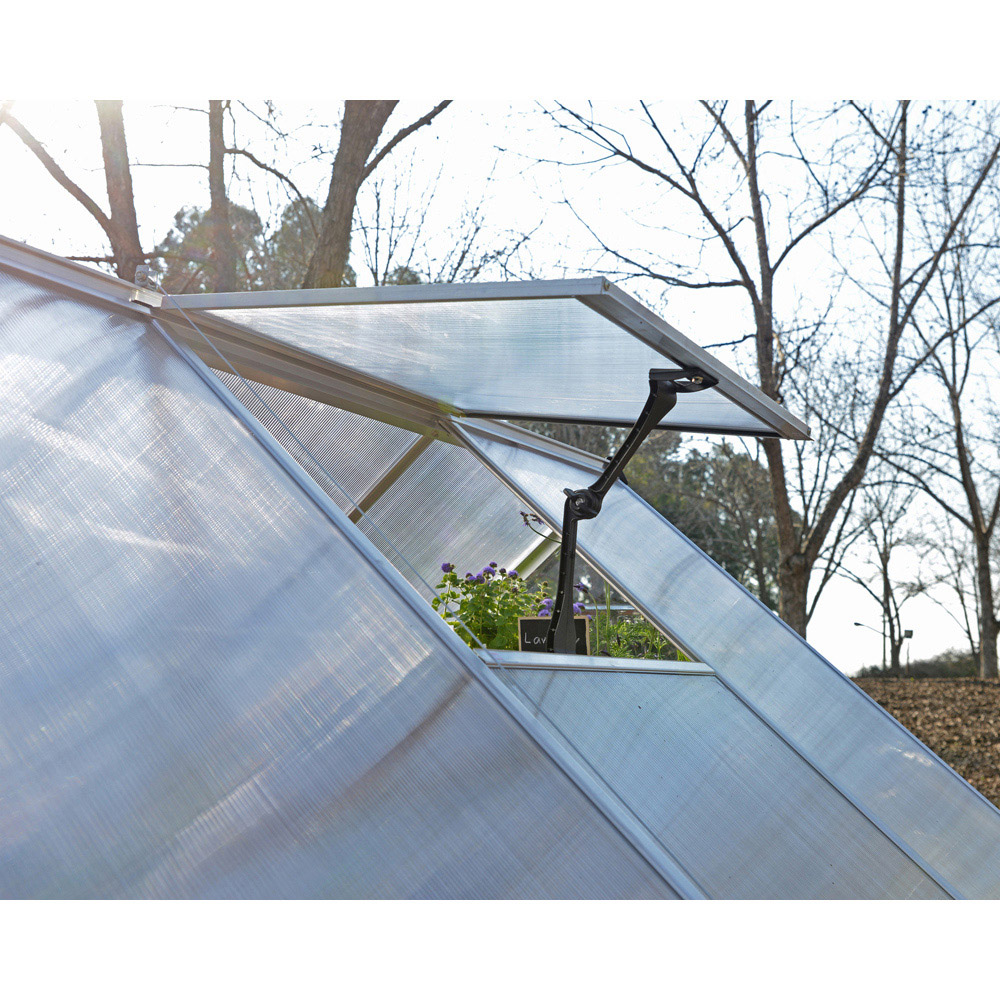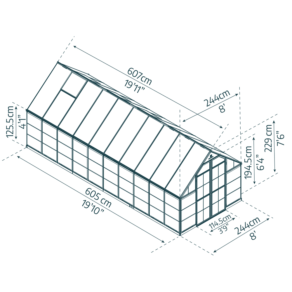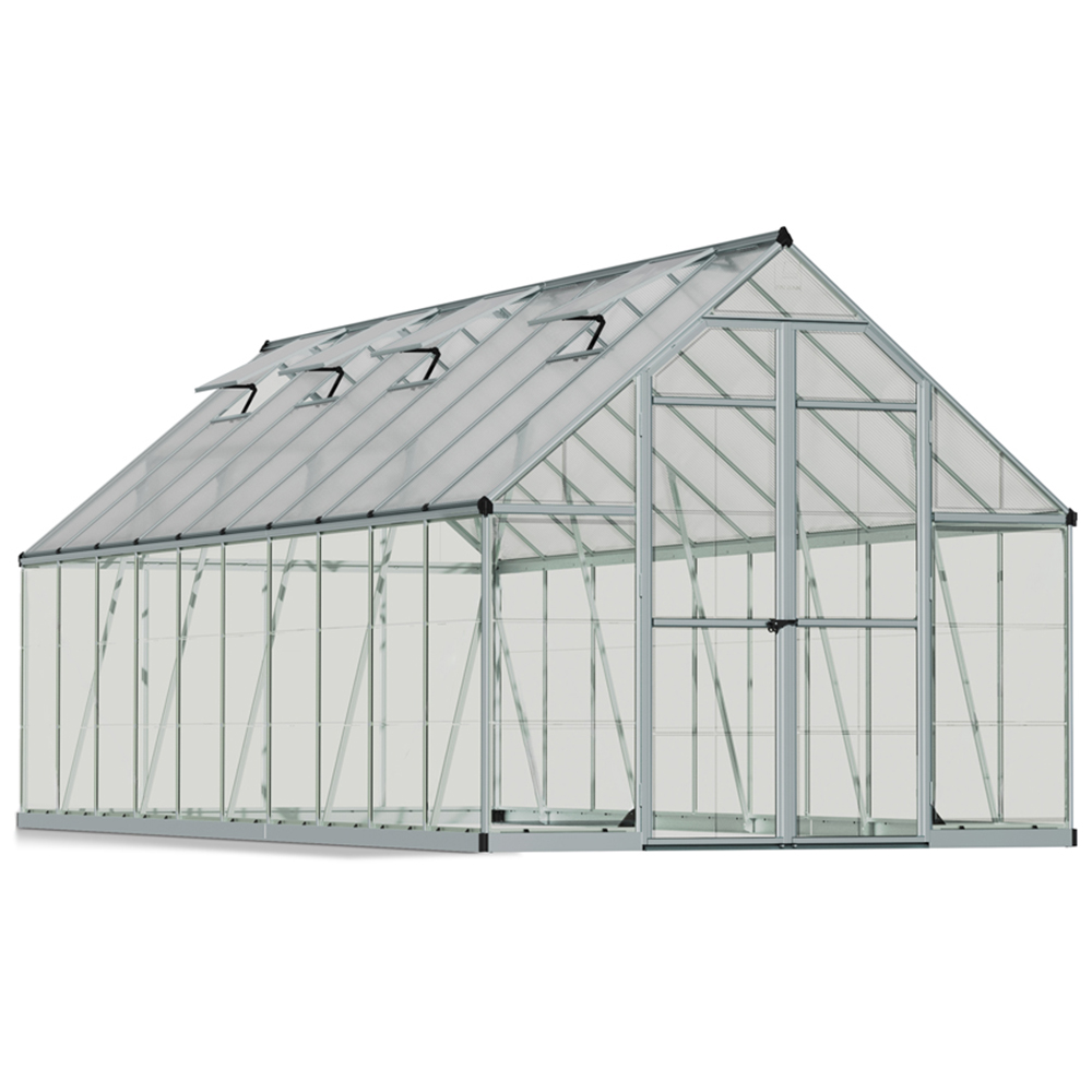 Transform your gardening journey with the Palram Canopia Balance Silver Aluminium Polycarbonate 8 x 20ft Extended Greenhouse. Crafted entirely from 100% recyclable materials, it features safe polycarbonate panels combined with a rust-resistant aluminium frame and extra strong support beams. This ensures that your greenhouse is not just a stunning addition to your garden but also a durable and reliable space. Whether you're tending to delicate seedlings or nurturing your favourite plants, you can feel assured that your greenhouse is built to last. With ample room to move around and a built-in gutter system for conveniently collecting rainwater, this greenhouse makes gardening more accessible and enjoyable. The low threshold ramp and lockable hinged doors add to its practicality, granting easy access and enhancing security. Don't miss your chance to elevate your gardening experience with a greenhouse that prioritises aesthetics and functionality.