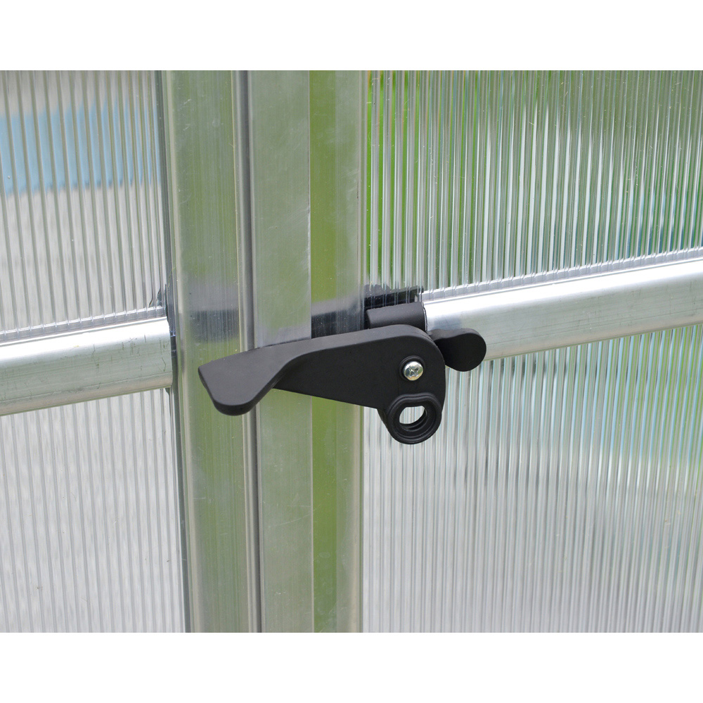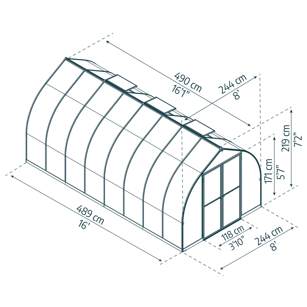 Step into the world of effortless gardening with the Palram Canopia Bella Silver Polycarbonate 8 x 16ft Greenhouse. Engineered with virtually unbreakable twin-wall polycarbonate panels, the greenhouse offers unmatched sunlight diffusion, heat insulation, and safety, making it your ideal gardening companion. Its elegant bell shape enhances wind resistance and ensures that snow slides off with ease, protecting your precious plants through every season. Inside, you'll find plenty of space to work comfortably and move around, while the manual adjustable roof windows provide excellent ventilation control for optimal plant growth. With thoughtful features like a low threshold ramp and secure lockable hinged doors, the greenhouse combines practicality with style.