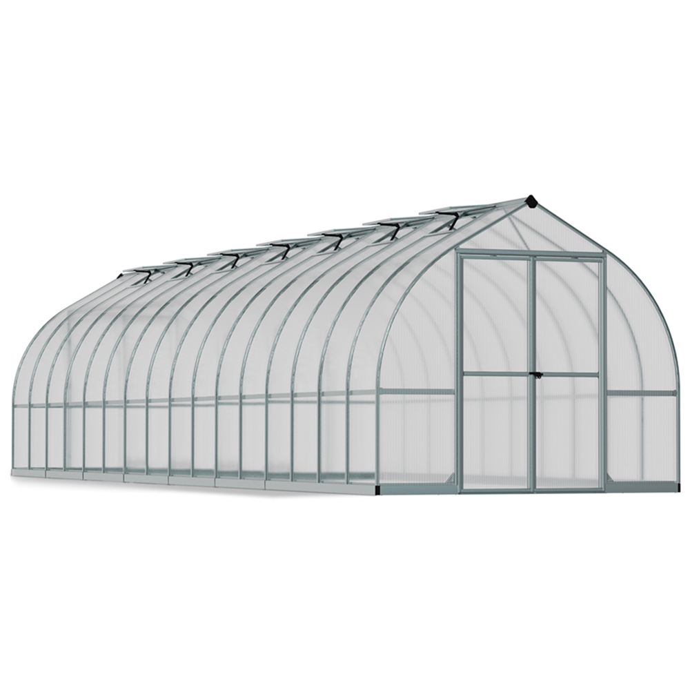 Step into the world of effortless gardening with the Palram Canopia Bella Silver Polycarbonate 8 x 32ft Greenhouse. Engineered with virtually unbreakable twin-wall polycarbonate panels, the greenhouse offers unmatched sunlight diffusion, heat insulation, and safety, making it your ideal gardening companion. Its elegant bell shape enhances wind resistance and ensures that snow slides off with ease, protecting your precious plants through every season. Inside, you'll find plenty of space to work comfortably and move around, while the manual adjustable roof windows provide excellent ventilation control for optimal plant growth. With thoughtful features like a low threshold ramp and secure lockable hinged doors, the greenhouse combines practicality with style.