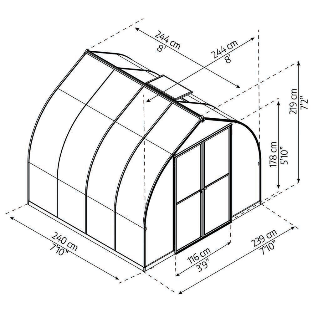 The Palram Canopia Bella Silver Polycarbonate 8 x 8ft Greenhouse is a beautiful and practical wide greenhouse that features virtually unbreakable twin-wall polycarbonate six-millimetre panels, creating an ideal combination of sunlight diffusion, heat insulation, and safety for all your gardening needs. The bell-shaped greenhouse was specifically designed to improve wind resistance and allow snow to easily slide off. The extra-large workspace and wide double doors allow the most avid gardener plenty of room to grow an abundance of vegetables and herbs and still have room for transplanting tender plants and for storing tools and accessories. Designed in silver, it is a strongly built, attractive greenhouse that will offer you years of gardening enjoyment. This greenhouse also includes a galvanized, rust-resistant steel perimeter base for additional structural support, stability, and alignment. Bella, for a stunning and functional addition to your gardening experience. Size: 8 x 8ft.