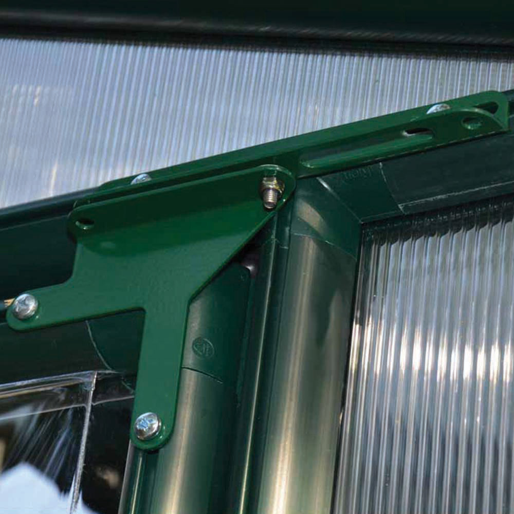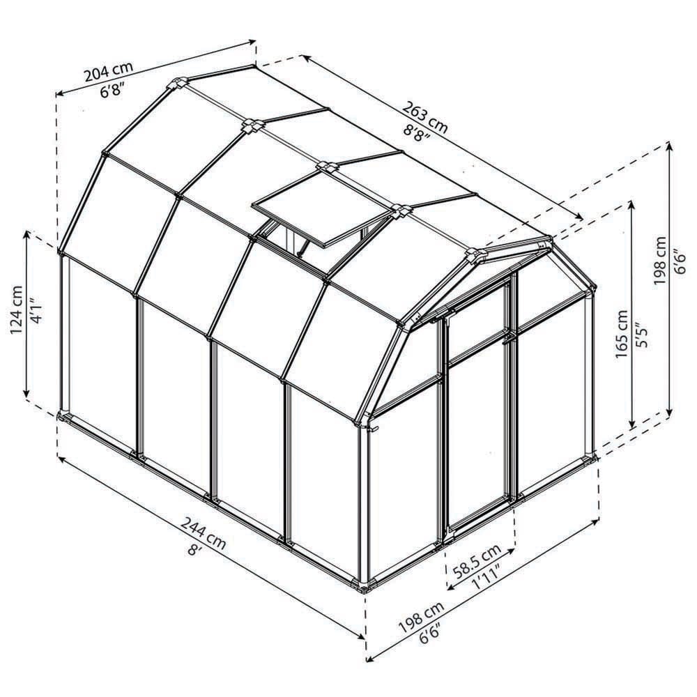 The Eco Grow greenhouse is the economical choice for greenhouse growers. It has all of the features and designs of the larger models in a more compact size. Manufactured with virtually unbreakable, high impact and hail resistant four-millimetre twin-wall polycarbonate roof panels and six-millimetre twin-wall side panels, it offers superior strength, safety, light diffusion and great heat insulation. These panels also provide 80% light transmission, blocks harmful UV rays and are 100% UV protected; they do not discolour, fracture or shatter. The weatherproof durable resin frame features a simplified installation with the pin-and-lock assembly system, and the panels are simple to slide into place. Hinged door with latch and included roof vent provide excellent ventilation. Size: 6 x 8ft.