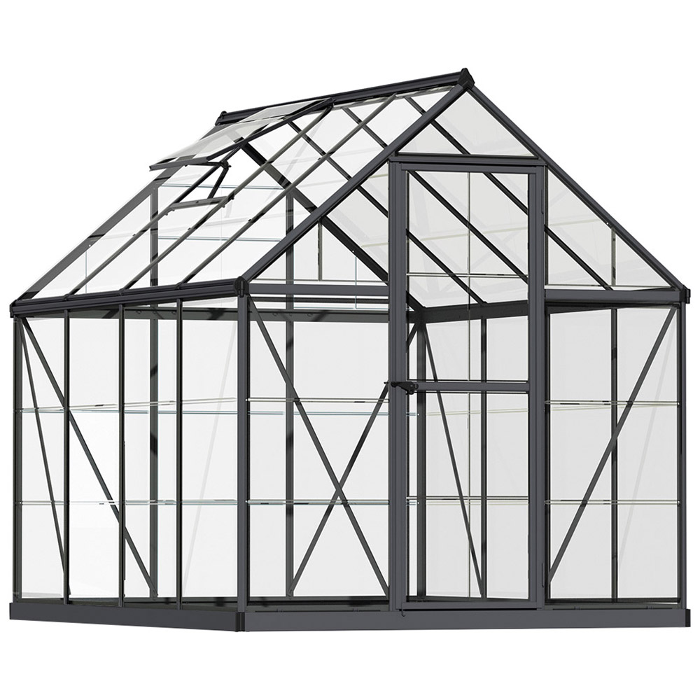 Grow your own organic fruits and vegetables with Palram Canopoi Harmony Grey 6 x 8ft Greenhouse. This wonderful greenhouse includes a perimeter, rust-resistant galvanised steel base and powder-coated, corrosion-resistant aluminium frame for long-lasting durability. It’s made of crystal-clear, virtually unbreakable polycarbonate panels, that are simple to slide and lock into position, and a rust-resistant powder-coated grey aluminium frame. The vent window helps maintain the desired temperature and humidity levels and provides ventilation. With its sleek and smooth design, the finished result is beautiful, functional, sturdy, and built to last.