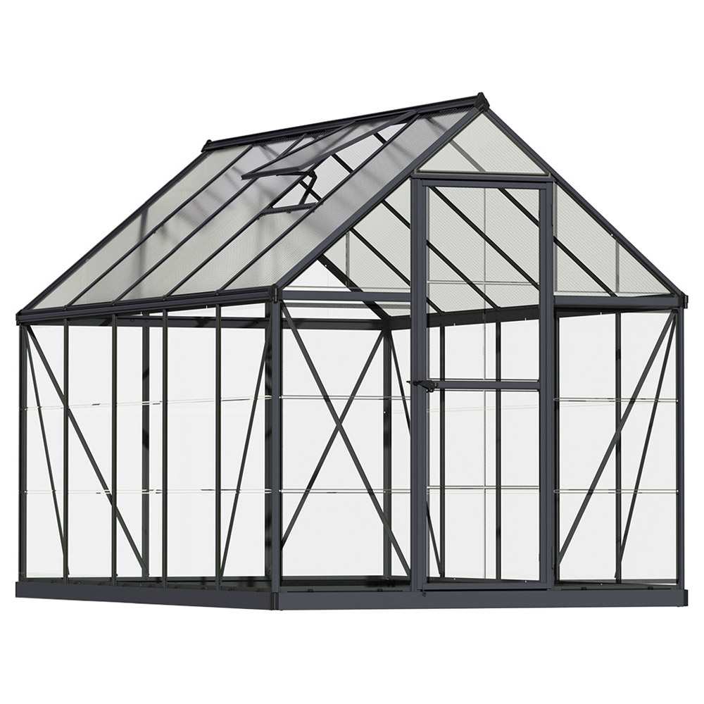 Create a controlled gardening environment with Palram Canopia Hybrid Grey 6 x 10ft Greenhouse. Perfectly designed to fit smaller spaces - it offers the gardening enthusiast a precise balance of two advanced virtually unbreakable polycarbonate panels along with a strong, grey powder-coated, durable rust-resistant aluminium frame. The twin-wall roof panels block up to 100% of harmful UV rays and diffuse direct sunlight while the crystal-clear side panels offer over 90% light transmission. Strong and attractive, this greenhouse offers years of maintenance-free gardening enjoyment.