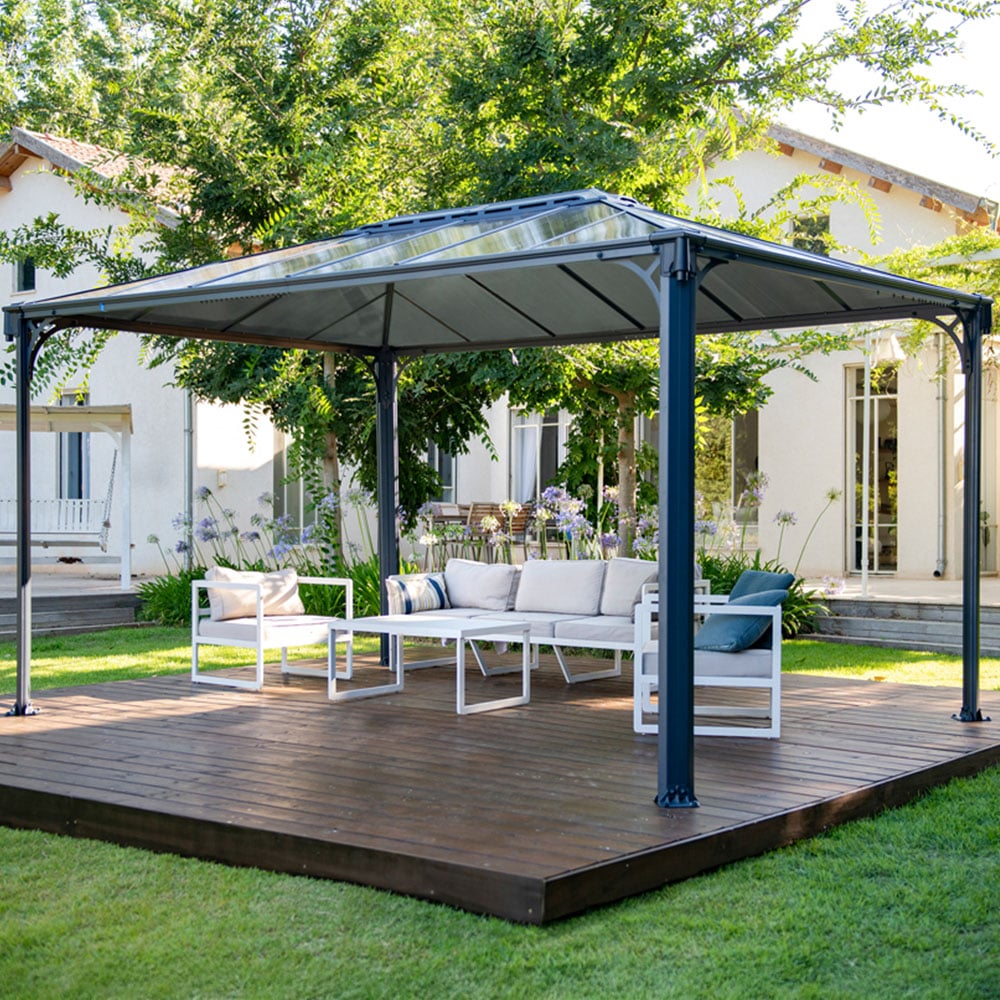 Make your outdoor experience a shade more refreshing with the Martinique Garden Gazebo. Use this beautiful open gazebo in your backyard as a cool retreat from the lazy hazy days of summer, host family gatherings, lavish dinners, an outdoor spa, or just sit back, enjoy the fresh air and the view of your garden with this DIY outdoor gazebo. The Outdoor Gazebo has matt grey panels that are UV protected on both sides. Utilising the unique 'Heat Block Technology' the full shade glazing prevents the sun’s rays from shining through making it cooler for an even more enjoyable outdoor experience.