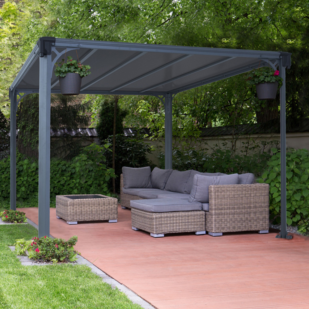 The Milano flat top gazebo has a clean look and gives you a place to lounge in refreshing solitude or to invite people to celebrate every day with you. The Outdoor Gazebo has matt grey panels that are UV protected on both sides. Utilising the unique 'Heat Block Technology' the full shade glazing prevents the sun’s rays from shining through making it cooler for an even more enjoyable outdoor experience. The gazebo has integrated rails so you can add curtains to personalise your gazebo and create some privacy or add netting to keep your area bug-free. If you're looking for a gazebo to fit your modern aesthetic, the Milano flat top open gazebo gives you that lounging area, garden decor, and a place to rest and have guests and parties with that clean look you love.