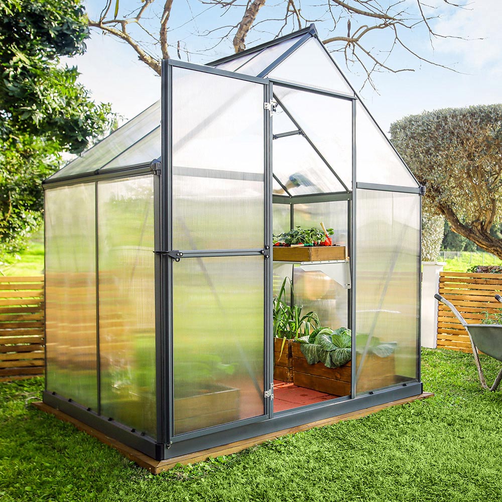 Enhance your plants' growing capabilities with Palram Canopoi Mythos Grey Greenhouse 6 x 4ft. This sleekly designed greenhouse helps you to maintain level temperatures and diffuse sunlight for sensitive plants while providing over 70% light transmission. It offers a hinged lockable door with a magnetic catch, a roof vent, gutters, and a galvanised steel base for improved stability, alignment and additional height. Elegant and practical - it is perfectly designed to protect your plants from the elements so you can start growing earlier and continue growing later.