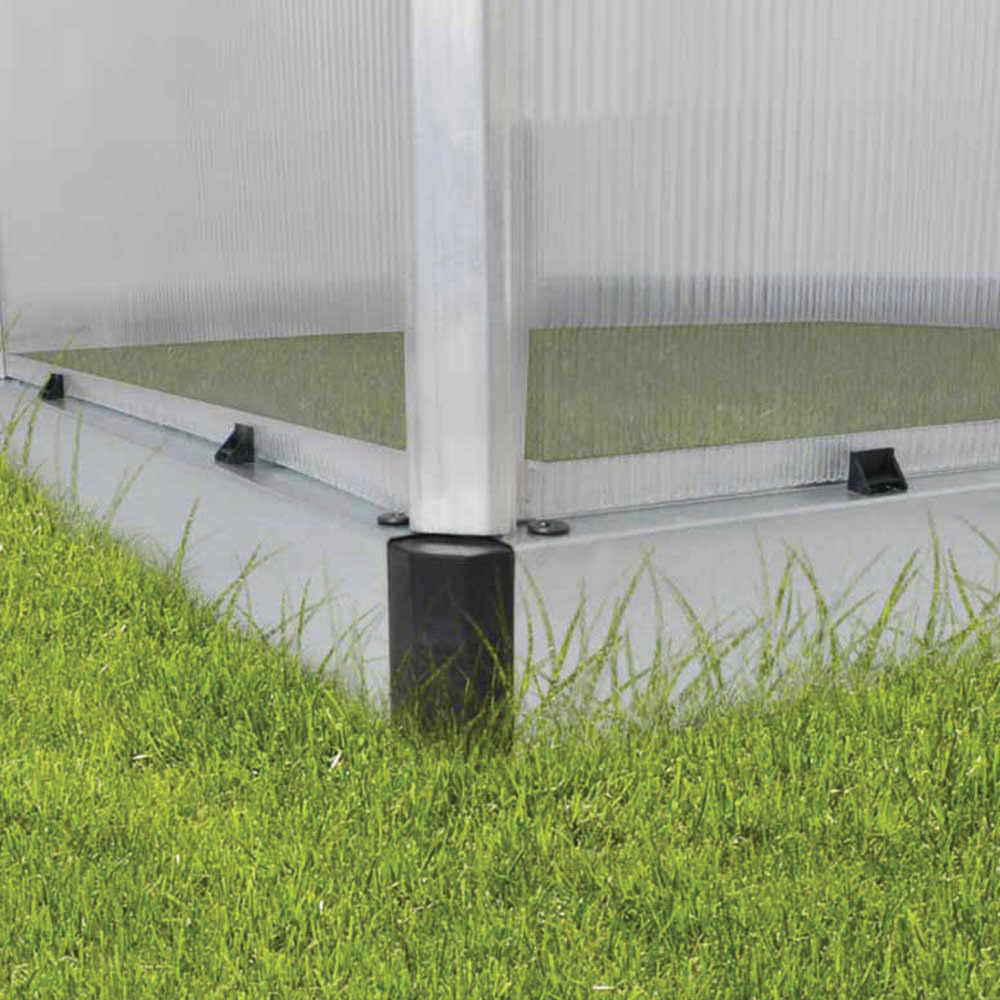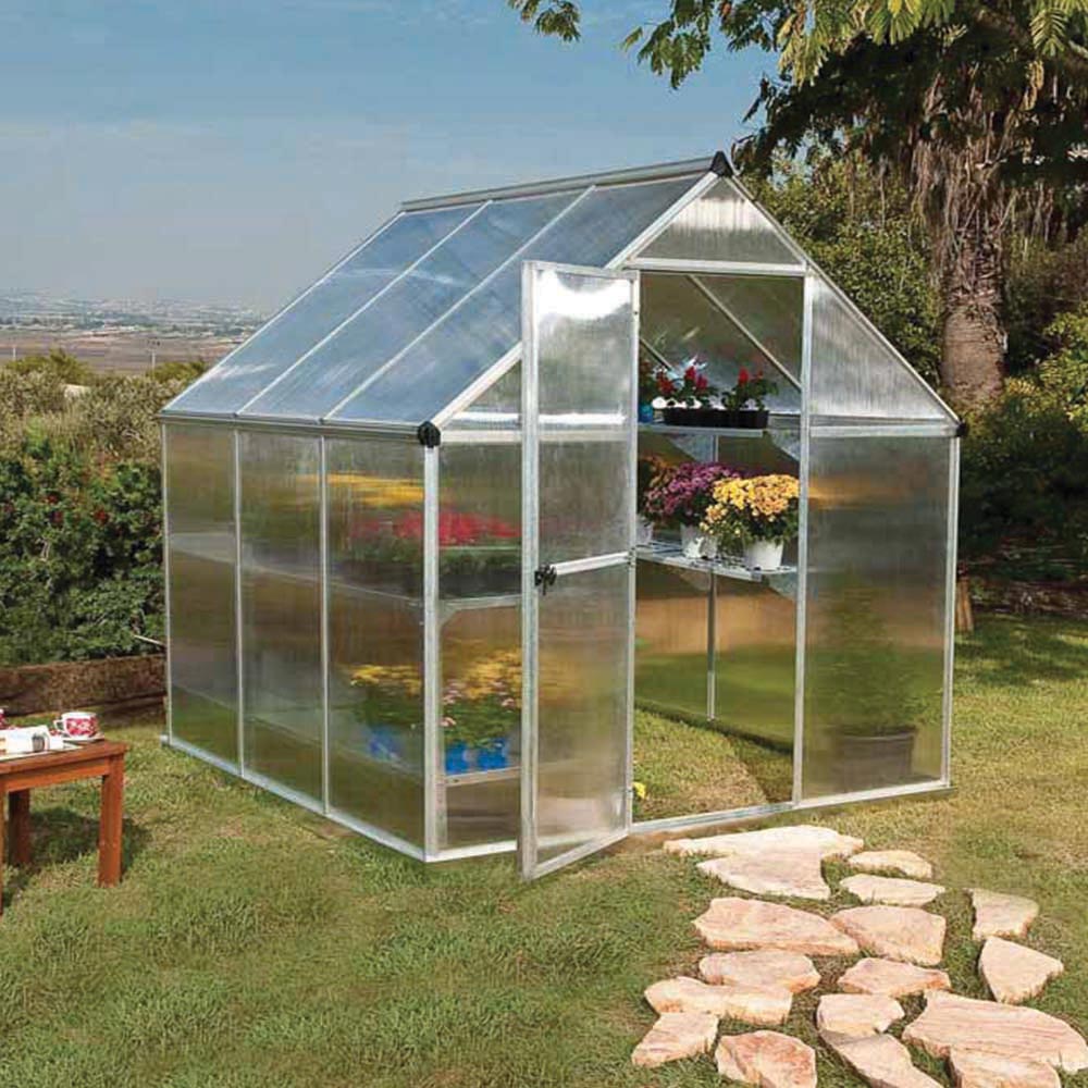 The Mythos Greenhouse is just the thing you need to create a nourishing atmosphere for growing plants and fruits. Designed in silver colour, it helps you to maintain level temperatures and diffuse sunlight for sensitive plants. It is a sleekly designed greenhouse, featuring virtually unbreakable, twin-wall polycarbonate panels, and a heavy-duty green powder-coated, rust-resistant aluminium frame. These panels do not discolour, fracture or shatter and provide over 70% light transmission, block harmful UV rays and are 100% UV protected. The greenhouse is elegant and practical, perfectly designed to fit in smaller spaces and protect your plants from the elements so you can start growing earlier and continue growing later. Size: 6 x 6ft.