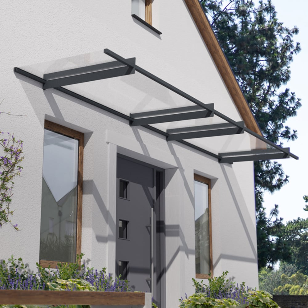 Elevate your home’s charm with the sleek and contemporary Palram Canopia Nancy 4100 Grey Clear Door Canopy. With its crisp, clear panels and galvanised steel support arms, this awning seamlessly adapts to various architectural styles, adding a touch of modern sophistication to any setting. Picture extending the coverage of your outdoor spaces, from your entryway to back patios, effectively shielding them from harsh weather for years to come. The ultra-resilient design is not only easy to install with the included hardware but also engineered for optimal protection. Plus, it features 4mm solid panels for peace of mind and durability. Enhance your home’s curb appeal while ensuring a safe and stylish environment. Dimensions: 4.2 x 0.9m.