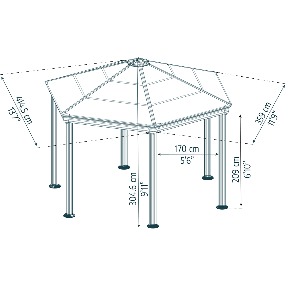 Elevate your outdoor experience with the exquisite Palram Canopia Roma 3.6 x 4.2m Grey Hexagonal Garden Gazebo. This luxurious gazebo serves as a refuge from rain or shade on hot days, perfect for hosting events, enjoying quiet moments with a book, or having family dinners. Key features include a unique screw-free roofing system, virtually unbreakable 6mm twin-wall polycarbonate panels, and treated bronze glazing that offers sunlight on cloudy days while providing shade on sunny ones. Engineered to resist severe weather, the robust structure withstands winds up to 120 km/h and snow loads of 250 kg/m². With a simple two-person DIY assembly, this gazebo includes anchoring footpads, sturdy aluminium poles, and a central hanging hook for added functionality. Crafted from weatherproof, maintenance-free materials, the gazebo transforms your outdoor area into a beautiful oasis to enjoy year-round.