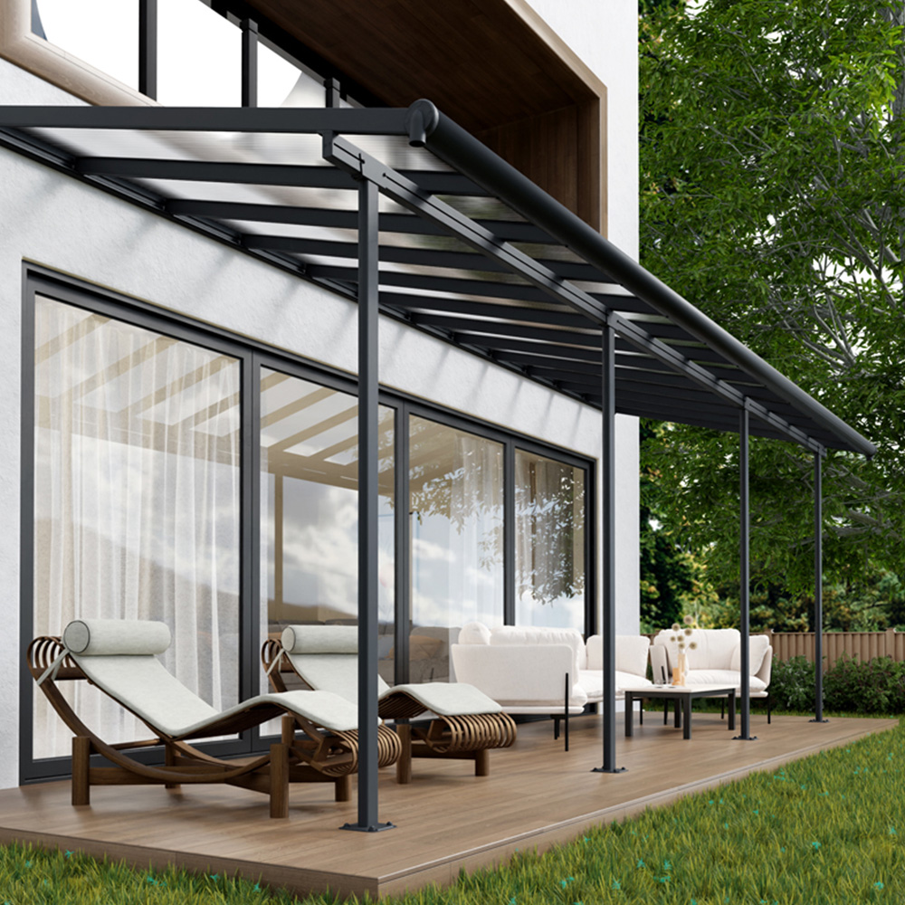 The flat roof patio design brings a modern feel to your space without competing with the look of your home. With flexible positioning, you designate the height where it connects to your home, the distance from the house, and the space between the front poles. Though it has a flat roof, the white Sierra Porch Cover has integrated gutter heads that divert water, keeping you dry and your outside space usable no matter the weather. Whether you are getting together with your family, having a cookout, or enjoying lounging outside in blissful solitude, you can enjoy it all year round. Make the most of your outdoor living space with the Sierra Patio Cover.