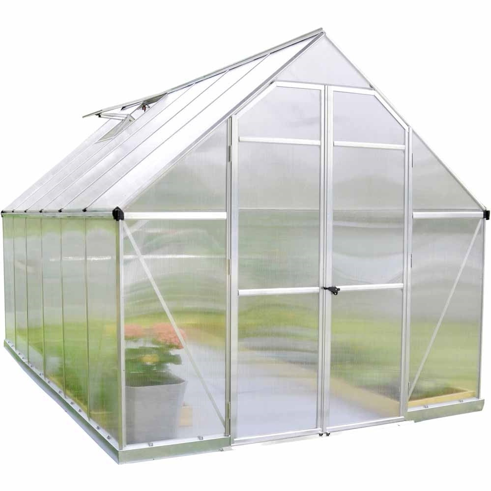 Grow plants with ease using this Palram Essence Silver Aluminium 8 x 12ft Greenhouse, It features high headroom and 8.7 sq.m. for improved working space, two vent windows for temperature, humidity and airflow regulation and wide double doors with low threshold offering you comfortable and easy access.