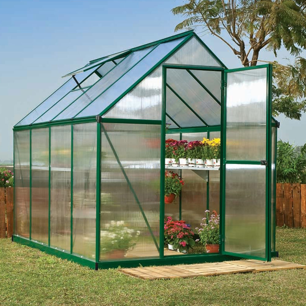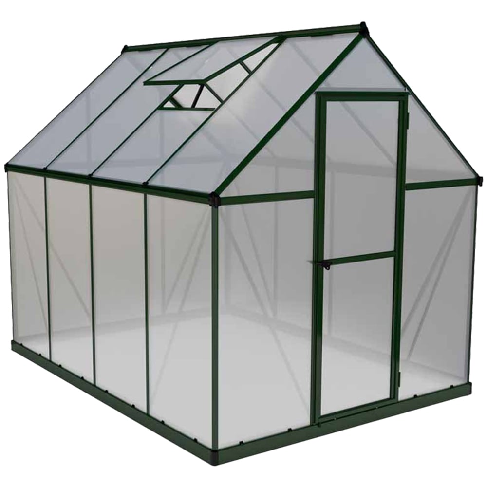 The Palram Mythos Green Aluminium 6 x 8ft Greenhouse is a sleekly designed greenhouse. It helps you to maintain level temperatures and diffuse sunlight for sensitive plants. It features virtually unbreakable, twin-wall polycarbonate panels, and a heavy-duty green powder-coated, rust-resistant aluminium frame.
