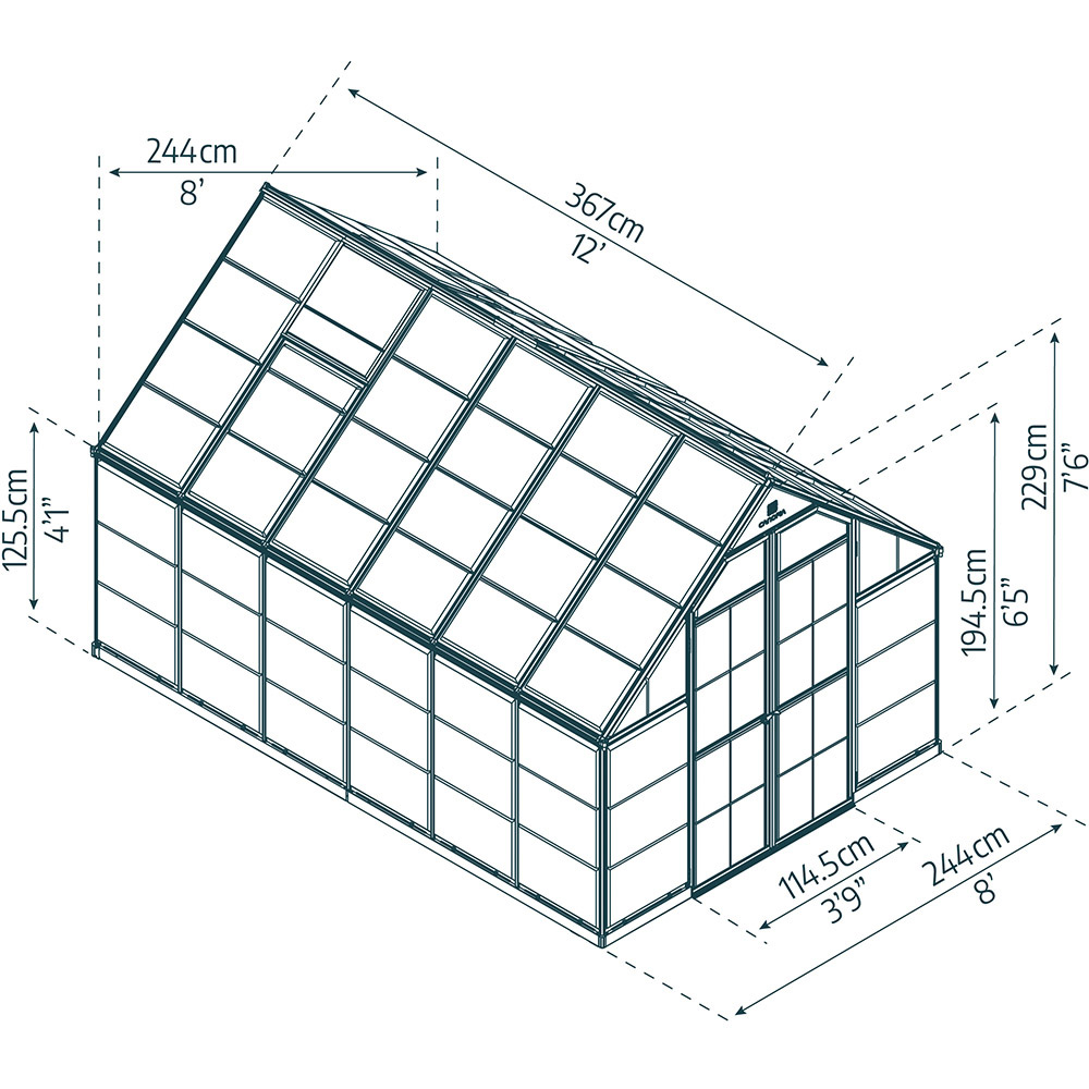 The Palram Octave Harmony Silver 8 x 12ft Greenhouse provides the enthusiastic gardener plenty of growing room with enough to spare for seeding and storing tools and supplies. With a large workspace and wide double door - this greenhouse features a rust-resistant, reinforced aluminium frame and crystal-clear, virtually unbreakable polycarbonate panels making it highly durable and maintenance-free. It is capable of withstanding harsh weather conditions for many years of gardening use.