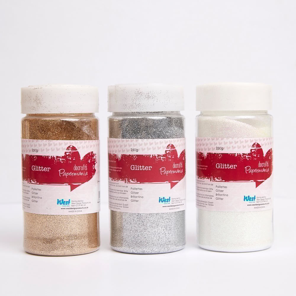 Add a touch of sparkle and shine to your art and craft projects with this Papermania Large Gold Glitter Pot 250g. It comes in a shimmering silver colour, and its container features a sprinkle cap for simple application. Whether you use it with stickers, paint, or glue, this glitter helps you add instant glamour to your creations.
