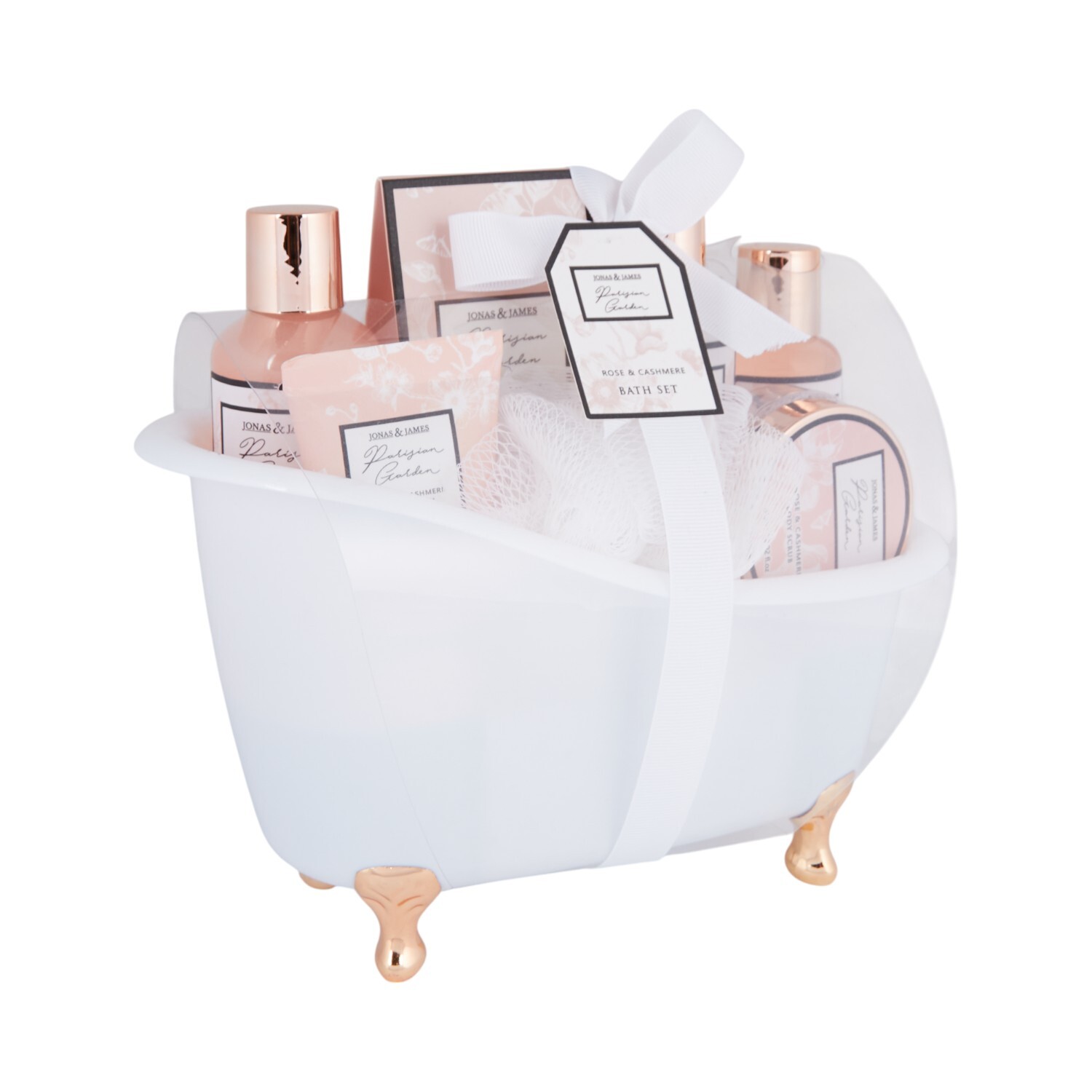 Indulge in a luxurious experience with the Parisian Garden Bath Gift Set. This bath collection is perfect for pampering a loved one or treating yourself. It comes in a charming plastic bathtub, making it perfect for gifting purposes. Ideal for creating a spa-like treatment at home, this set leaves the skin soft, nourished and delicately perfumed. Inside, you'll find a variety of bath essentials infused with notes of rose and cashmere for fancy self-care.