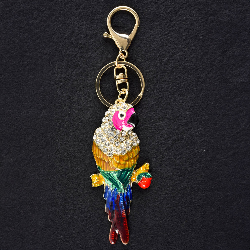 Bright and bold, this Parrot Key Charm is perfect for adding a bit of colour to your keys, bag, or purse. Featuring multicoloured feathers, a pink face, and silver sparkly gems around its head, this charm will add some fun to your keyring.