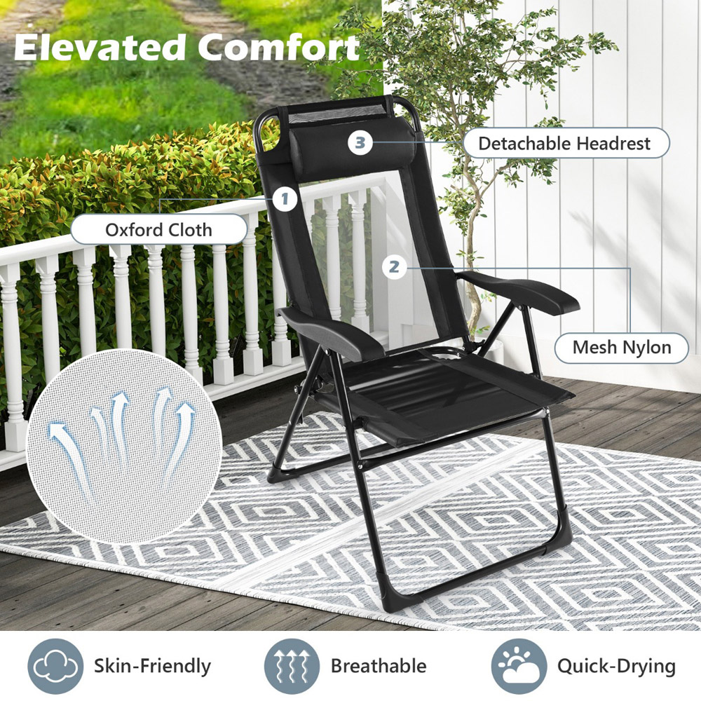 Elevate your outdoor comfort with the Costway Set of 2 Black Patio Folding Chairs. These chairs feature large-size seats with wide armrests, ensuring optimal comfort while sitting. The weatherproof Oxford cloth and breathable mesh nylon provide a skin-friendly seating area, perfect for any weather. With seven adjustable backrest positions, you can easily find the perfect angle for reading, sunbathing, or even sleeping. Constructed with a robust metal frame that resists rust and includes anti-slip footpads, these chairs offer high stability and durability. When not in use, they can be folded into a compact size of 90 x 59 x 12cm, making them easy to store and transport.