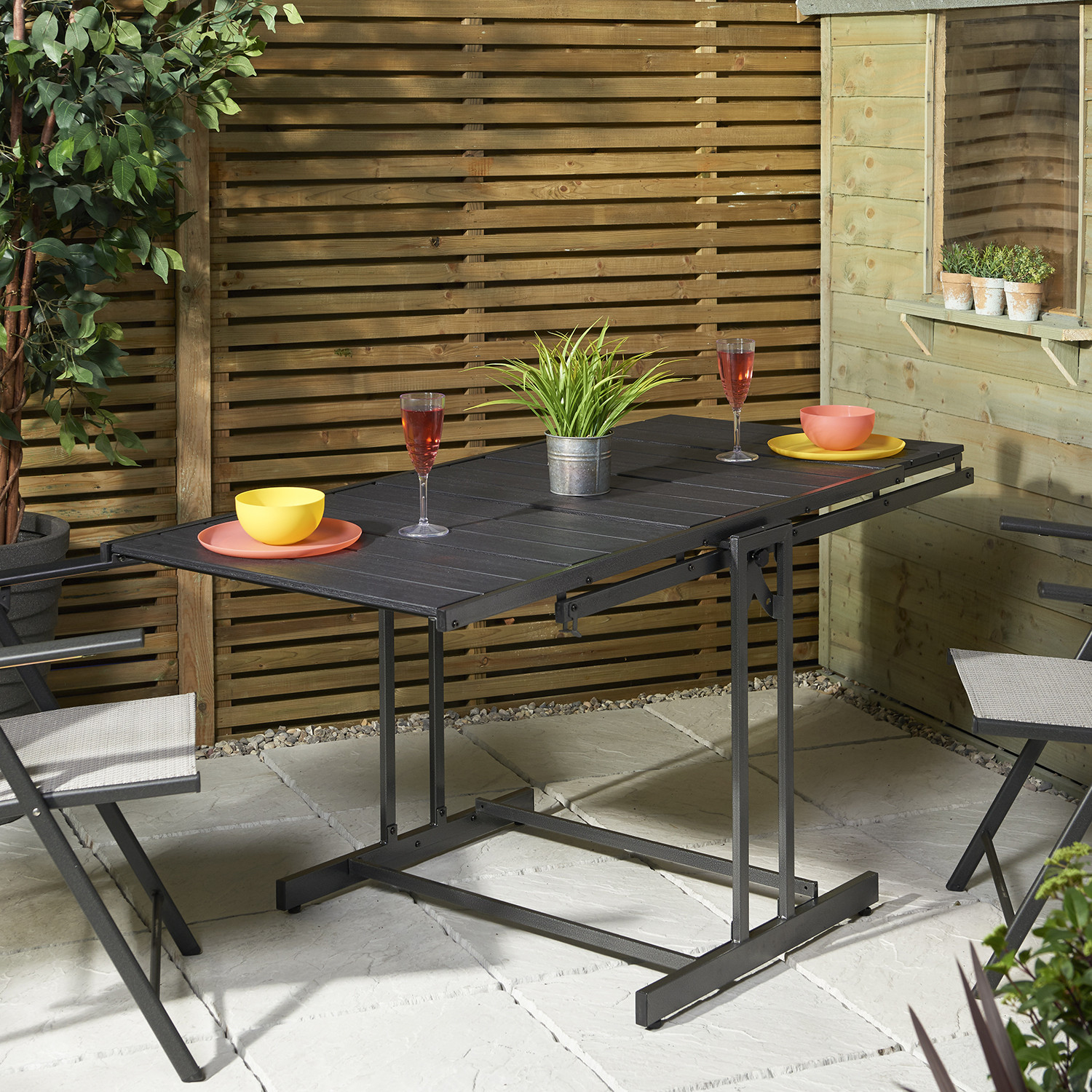 Coloured a flat black, this Folding Table Into Shelf is bound to fit in with any patio decor or colour scheme, while the authentic-looking wood grain throughout will add depth and texture. Protect your garden furniture with our durable and waterproof covers. Explore our wide range of heavy-duty