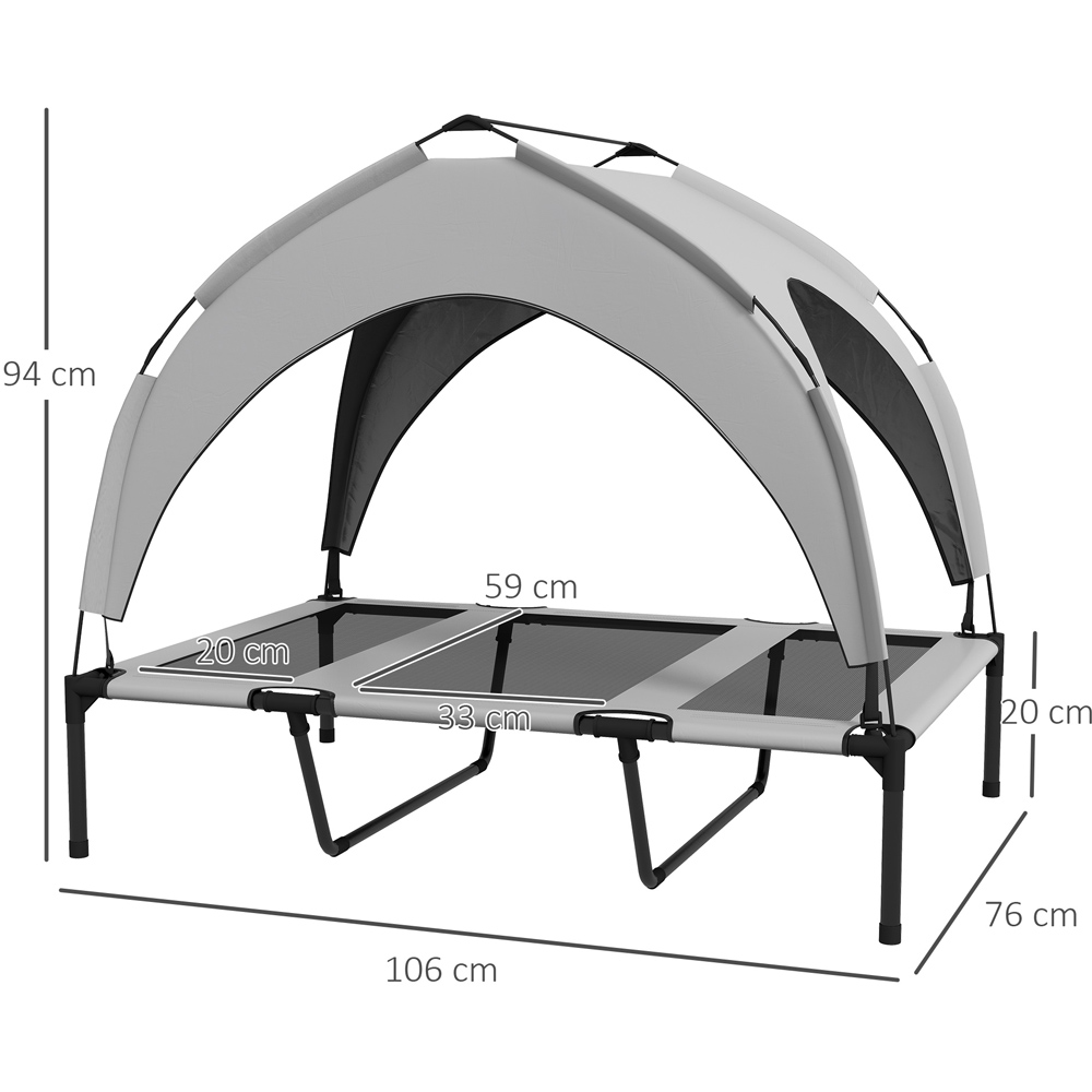 Give your pet the ultimate relaxation with the PawHut 106cm Light Grey Elevated Dog Bed with UV Protection Canopy. The elevated dog bed frame features a cot-style design that lifts your pets 20cm to keep them off the dirty ground and promote airflow underneath for a cool breeze. It is equipped with a removable UV protection canopy for extra shade on hot summer days and offers protection from light rain. Plus, the solid steel structure with four feet for stability and balance will retain its shape for years to come. This elevated dog cot can support up to 30kg.