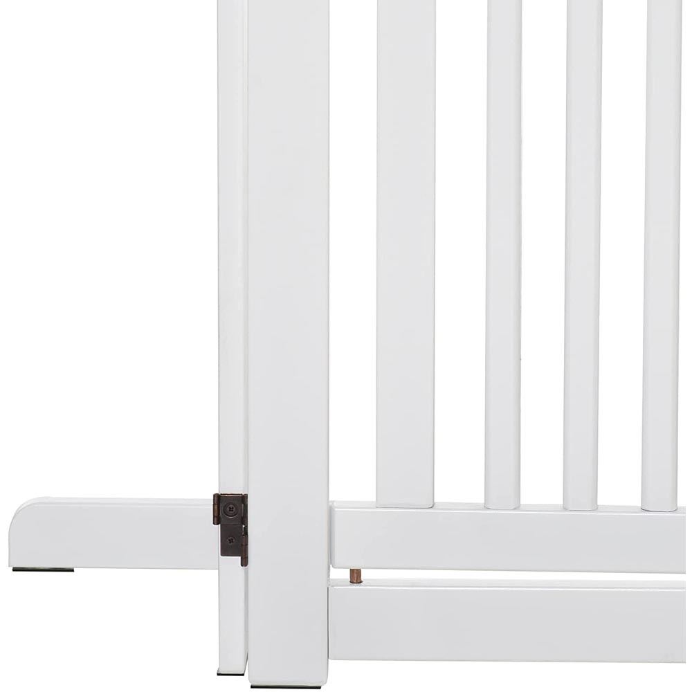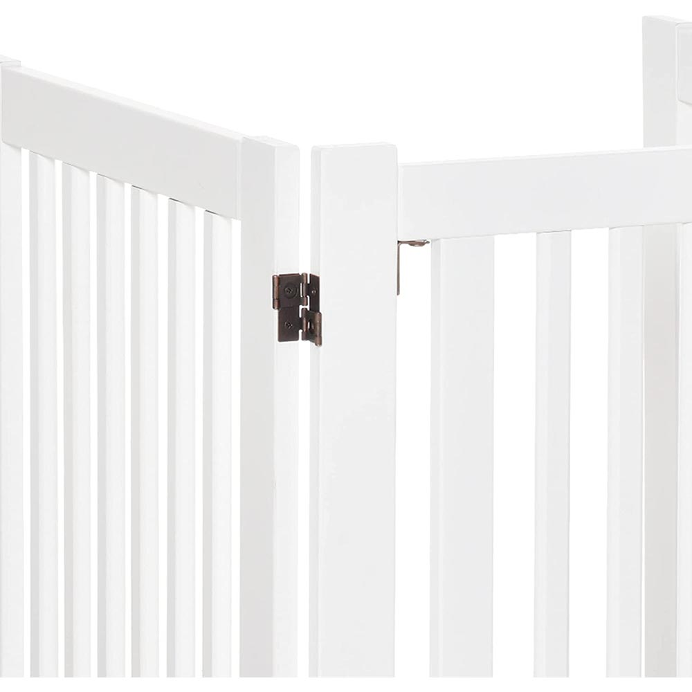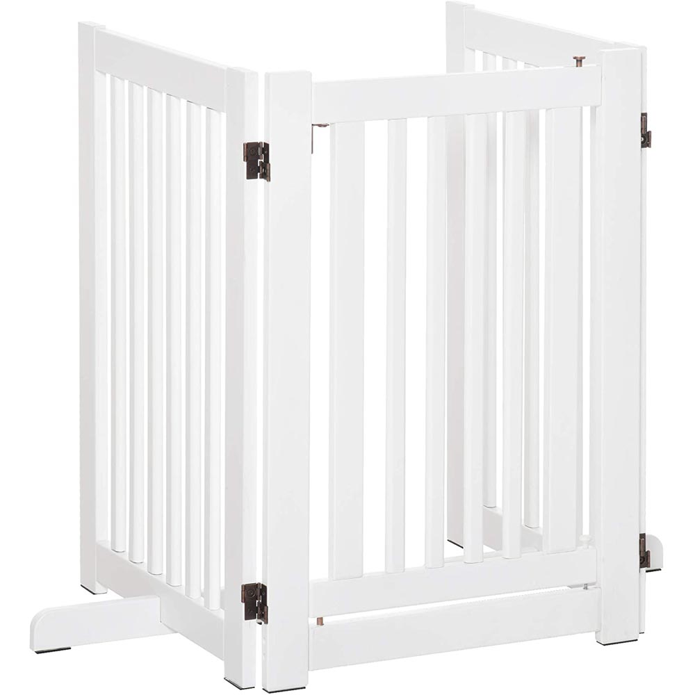 For when you need to keep your pets in one area at home, choose this white freestanding pet gate from PawHut. The three-panel freestanding design allows it to fit into spaces up to 155cm, MDF forms the frame for a solid and tough structure, with the panels connected together with hinges to move them into shape easily, with the middle door allowing easy entering and leaving. The bars on the panels keep your dog behind, without letting them feel closed off and it can be folded down easily for flat storage. It is finished with a latch on top of the middle door for security. Please note, this gate is suitable for small-medium sized dogs only.