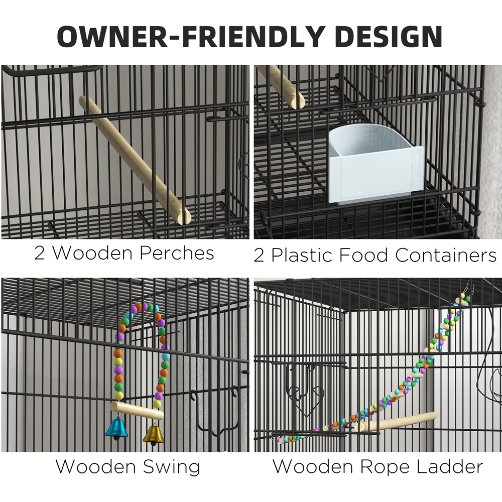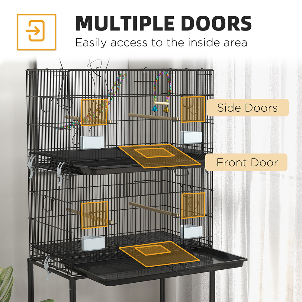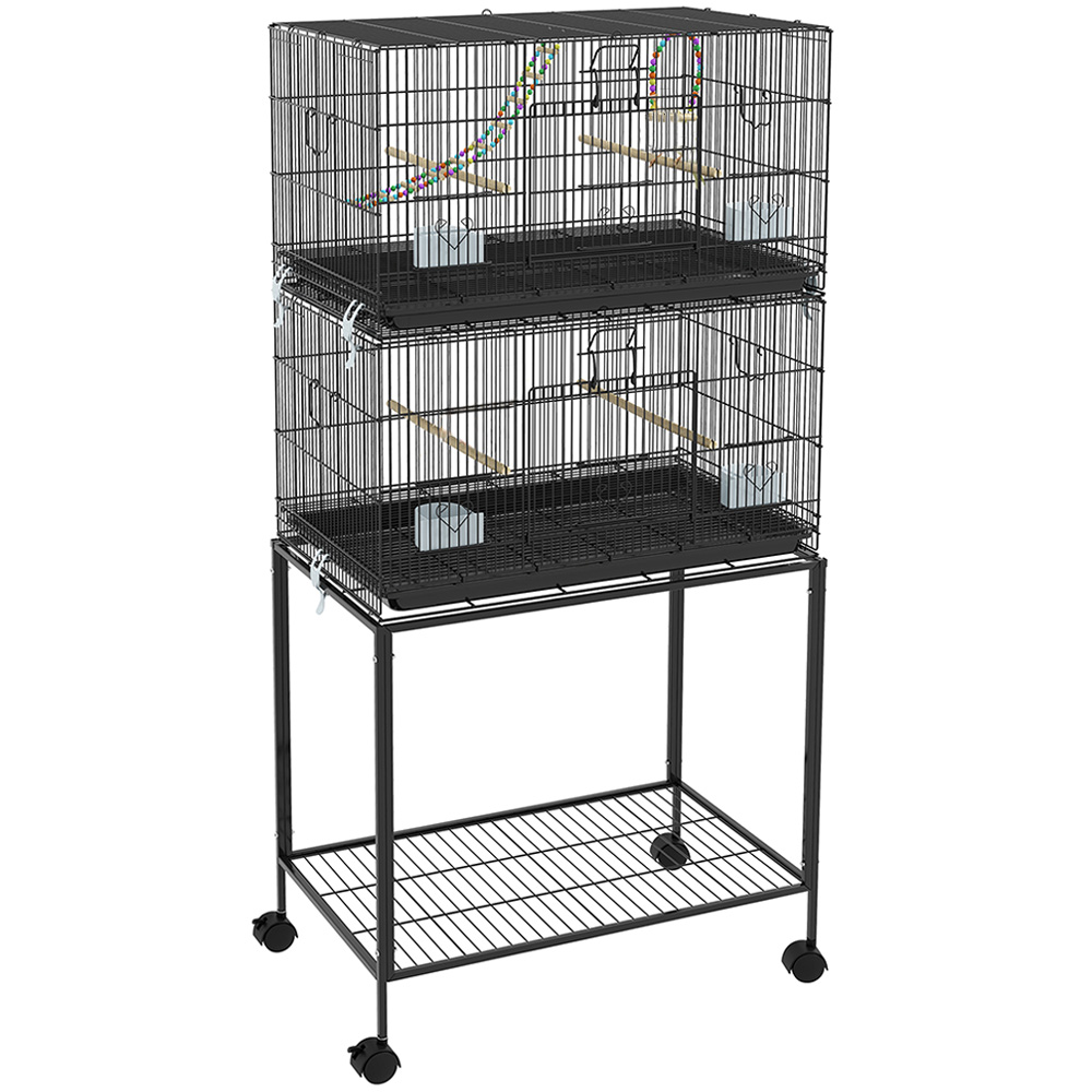 Treat your birds with the beautiful PawHut 2 Tier Bird Cage on Wheels with Stand for Canaries. This bird cage is great for housing feathered friends, keeping them safe and comfortable. The two-tier feature makes it spacious enough for multiple pets to live inside. They can relax on the swings and ladder, with enough room to stretch and flap their wings. The slide-out trays and bottom panels ensure effortless cleaning, keeping the space clean. The cage features lockable doors for safety, making it a secure home for birds to thrive in.
