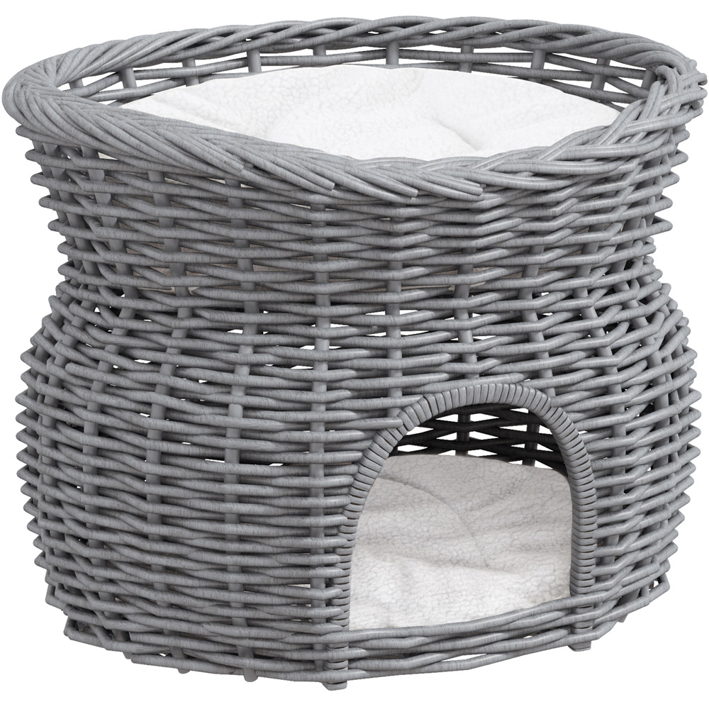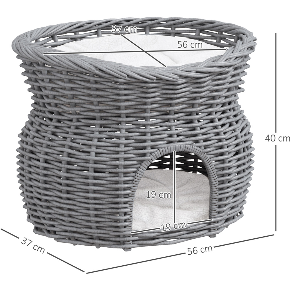 Enhance your cat's play and relaxation with the PawHut 2 Tier Elevated Pet Basket Bed. This stylish wicker cat house features a two-tier design, with an enclosed ground floor for resting and an open balcony for play. Crafted from hand-woven, non-toxic rattan, it offers durability and safety. The heavy-duty base supports up to 12kg, ensuring stability and long-lasting use. Perfect for both indoor and outdoor settings, this pet bed provides a secure and comfortable haven for your cat.