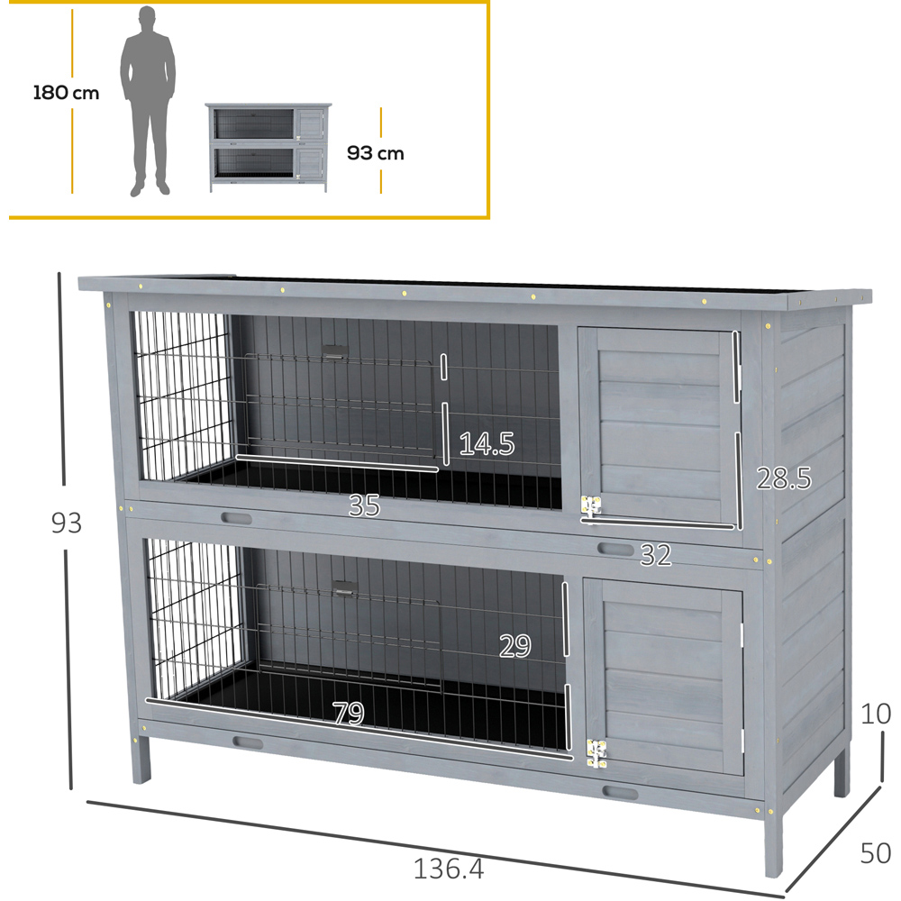 With this small animal cage for two pets from PawHut, small pets will roam, rest and play, thanks to its two-tier design, which can hold two pets. There are multiple side doors, making it easy to get inside and maintain the cage. A removable tray at the bottom of the hutch for simple cleaning, so their space stays tidy and comfortable. Finished with a fir wood structure, it provides a strong home, whilst the asphalt roof shelters them from hot and wet weather – suitable for outdoors. Please note: Rabbits need regular and frequent opportunities to exercise. Make sure your rabbits have opportunities to exercise every day to stay fit and healthy. Rabbits are most active in the early morning, late afternoon, and overnight, so every effort should be made to ensure rabbits have access to a large area to exercise at these times. The unit provides shelter, while rabbits should additionally be provided with a large living enclosure.