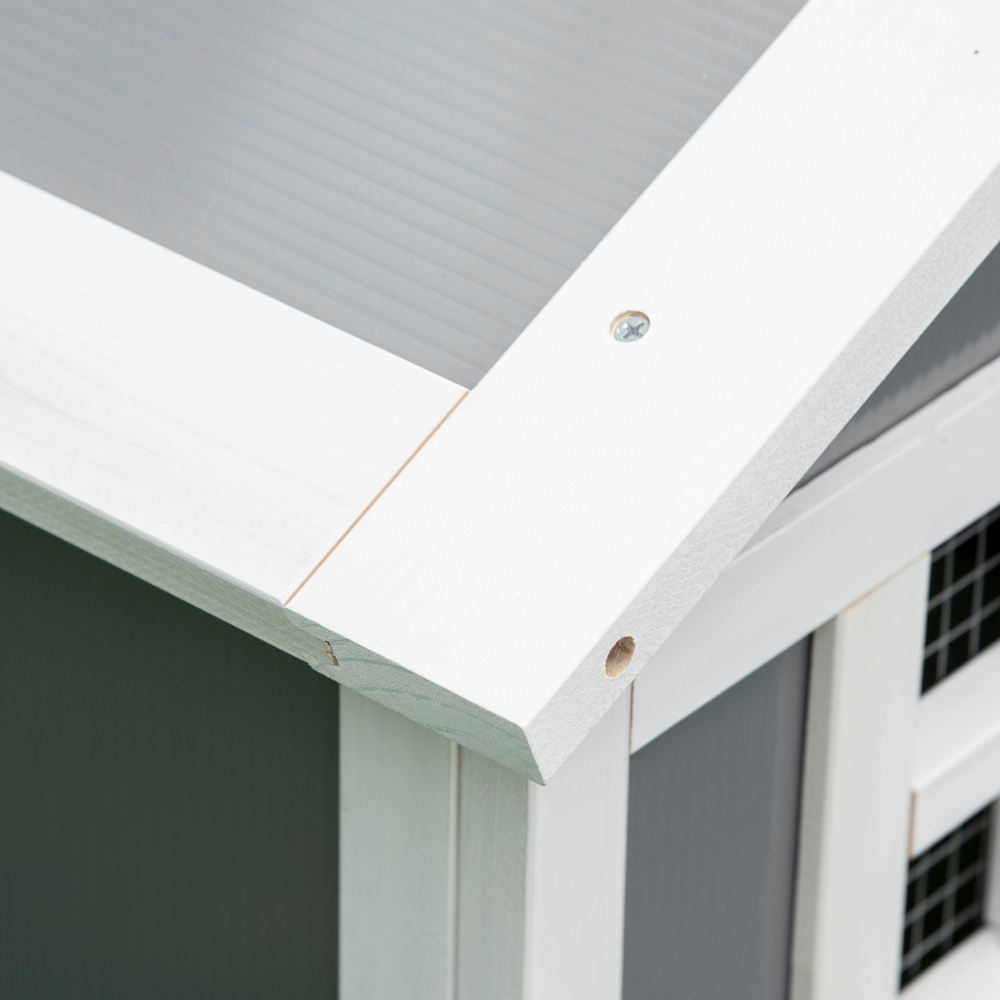 Ideal for small pets, the PawHut 2 Tier Grey Wooden Hutch with Sunlight Panel Roof features a cosy upper house for shelter and a spacious outdoor run for play and fresh air, accessed via a convenient ramp. It includes multiple lockable doors and a removable tray for easy cleaning. Built from solid fir wood, it offers stability and durability for daily use, while the sunlight panel roof provides protection from weather elements and enhances natural light transmission, ensuring a comfortable outdoor environment for your pets.