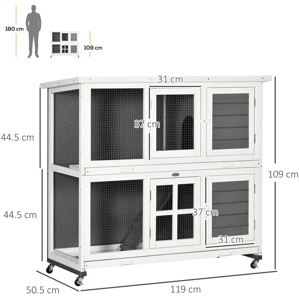 Provide small pets with the protection and comfort they need using this PawHut 2-Tier Grey Wooden Rabbit Hutch. Perfect for rabbits, guinea pigs and other similar animals, this hutch has two tiers so pets can have space and won't feel trapped. There are multiple doors for access, while the removable trays make cleaning a breeze. Crafted in wood and covered in water-resistant paint, the asphalt roof keeps them sheltered, making it perfect for the outdoors. Moreover, easy to move, the hutch is finished with four wheels at the bottom for effortless movement. This hutch is suitable for two to four rabbits. Please note: Rabbits need regular and frequent opportunities to exercise. Make sure your rabbits have opportunities to exercise every day to stay fit and healthy. Rabbits are most active in the early morning, late afternoon, and overnight, so every effort should be made to ensure rabbits have access to a large area to exercise at these times. The hutch provides shelter, while rabbits should additionally be provided with a large living enclosure.
