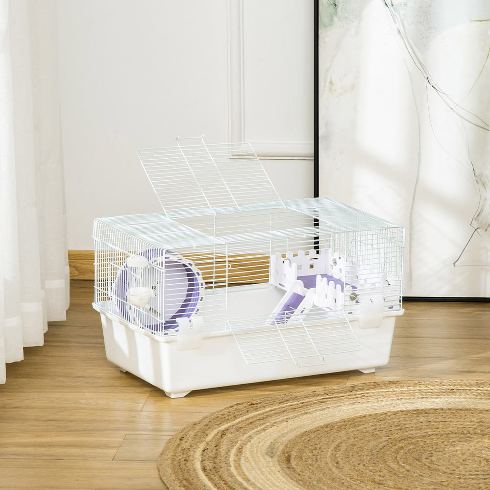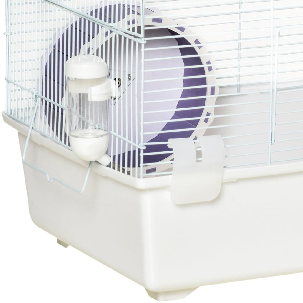 Ensure your hamster is happy and healthy with PawHut Two Tier Hamster Cage Rodent House. With two levels, a ladder, a water bottle and an exercise wheel, they have all the necessities to stay occupied throughout the day. Keep their new home hygienic by removing and cleaning the plastic tray. Just take your pet from the cage when maintaining, using the front or top opening. Assembly required. Material: Steel wire, PP, MDF. Overall dimension: H33 x W35 x L60cm (without water bottle). Bottom size: H16.5 x W35W x L60cm. Door size: 28W x 15Hcm(Front), 28.5W x 25Hcm(Top). Fenced platform size: H7 x W14.5 x L32cm. Ladder size: 16.5L x 7Wcm. Exercise wheel size: 18.5 x 6Wcm.