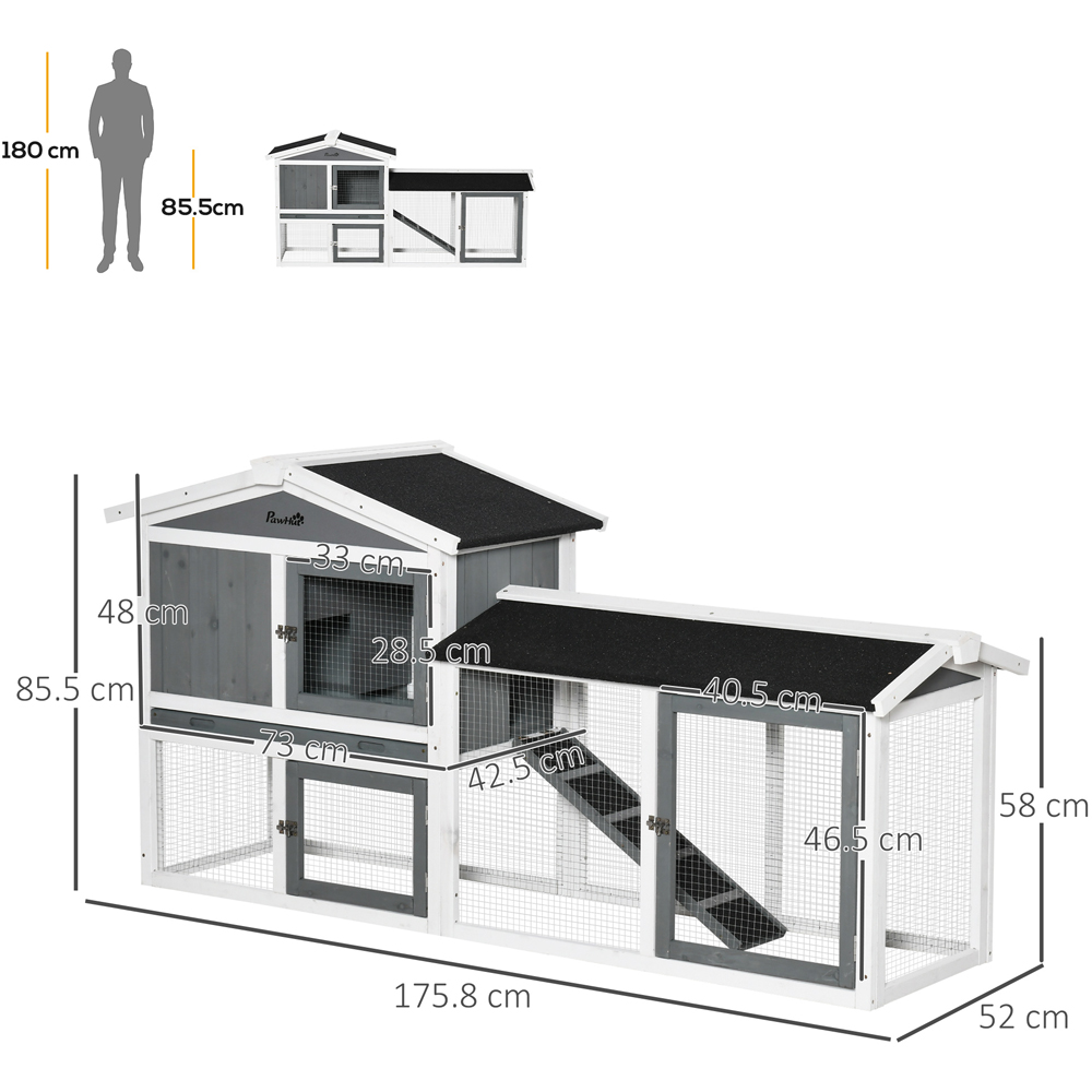 Ideal for indoor or outdoor use, the PawHut 2 Tier White Wooden Hutch provides spacious accommodation for up to three rabbits or similar-sized pets. Featuring a water-resistant paint finish and tilt asphalt roof, it ensures durability and protection from the elements. Your pets will enjoy ample space to roam, play, and rest with a main house, outdoor run, and ramp includes. The galvanised wire construction allows easy monitoring, while lockable doors provide security. Cleaning is effortless with a removable tray. Sturdy and stable, this hutch is crafted for daily use, offering your pets a comfortable and secure living environment.